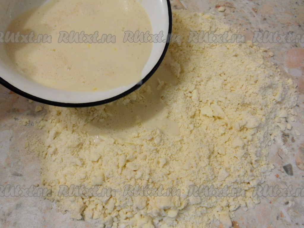 Из мучной крошки сформировать горку, посередине сделать углубление. Влить жидкую смесь.