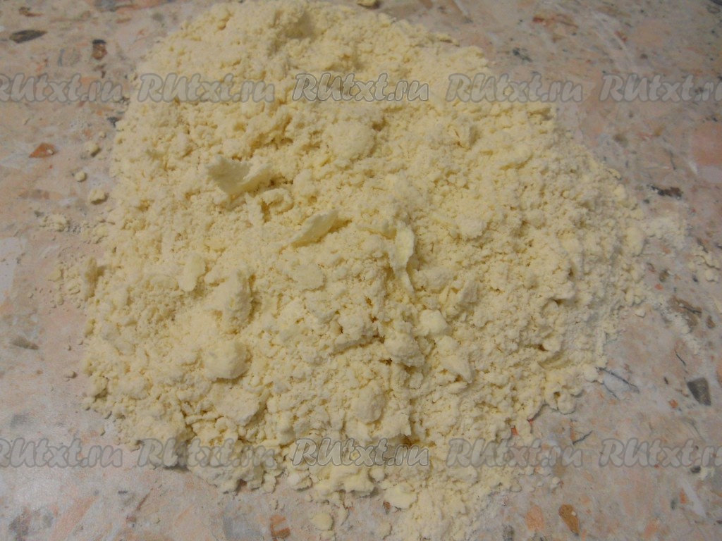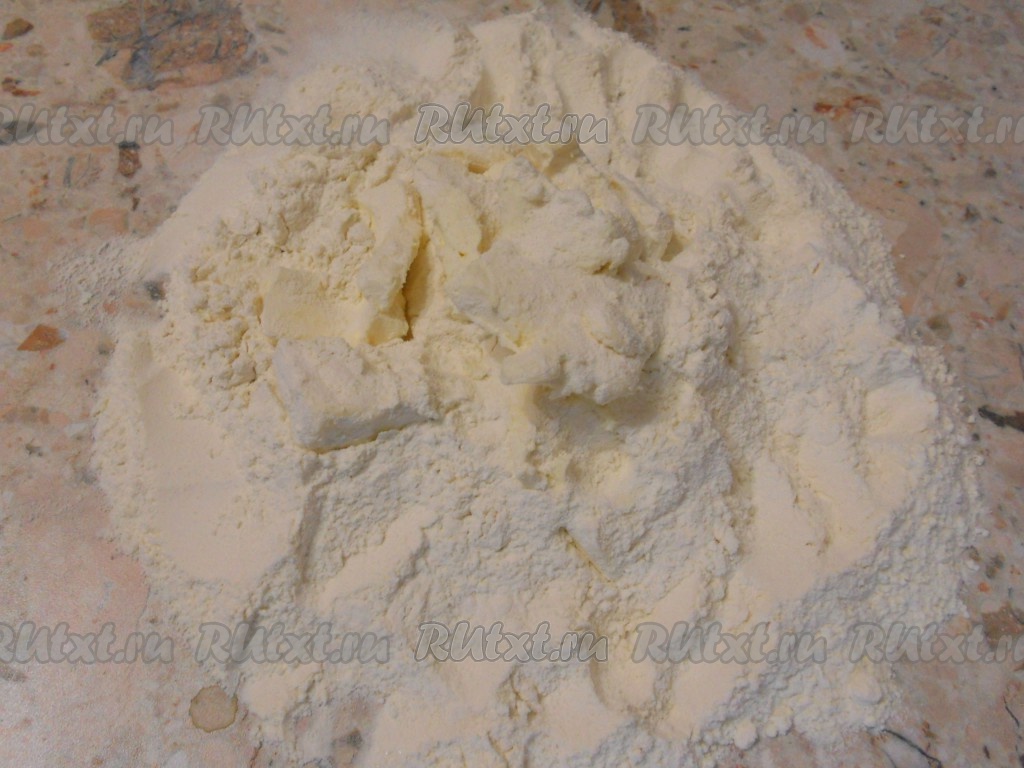 Просеять муку на стол, смешать с солью и оставшимся сахаром. В муку порезать кусочками (или натереть) сливочное масло.