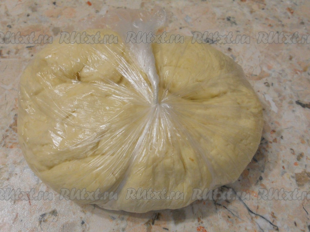 Замесить гладкое, мягкое тесто (если понадобится - добавить еще муки или воды). Завернуть тесто в пищевую пленку или целлофановый пакет и поместить в холодильник на 1,5-2 часа.