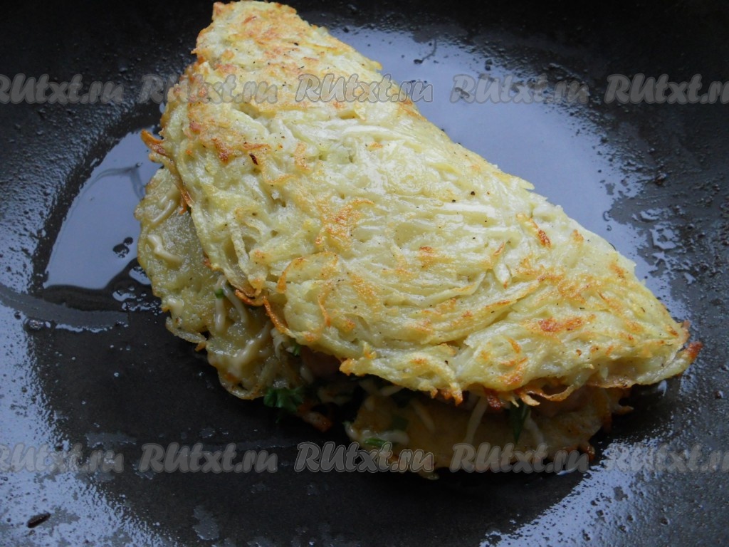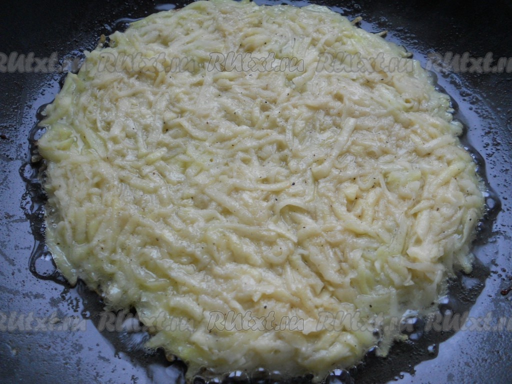 Влить в сковороду немного растительного масла, разогреть и выкладывать картофельную массу, формируя ложкой круглую лепешку (лепешки лучше делать не на всю сковороду - так легче переворачивать).