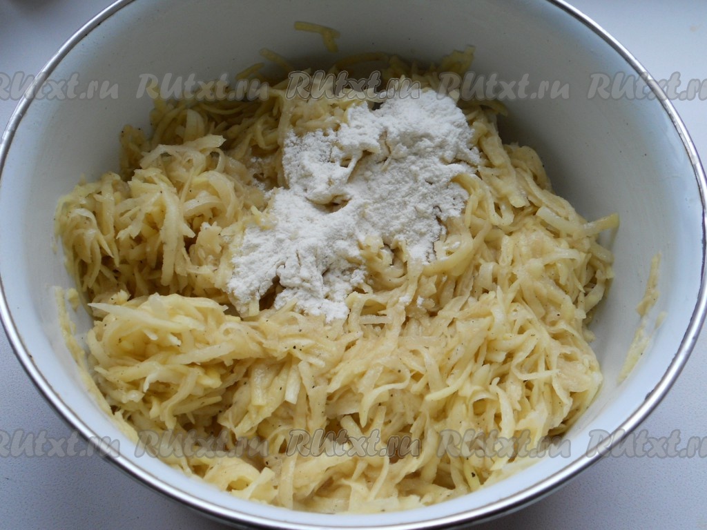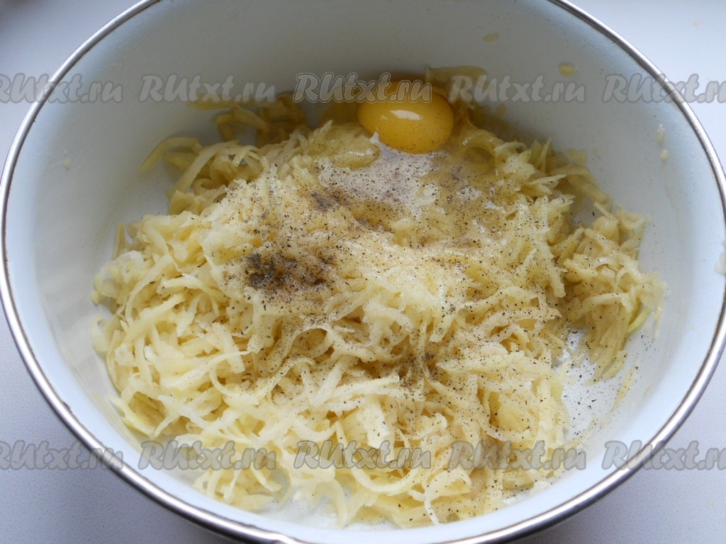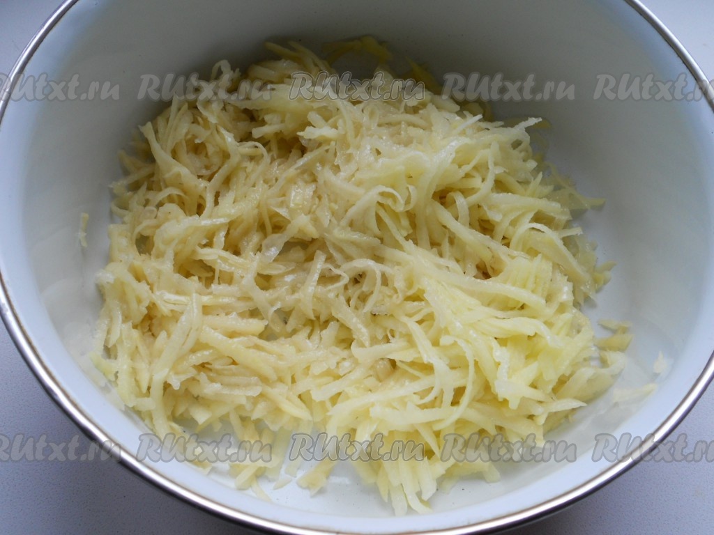 Картофель очистить и натереть на крупной терке. Отжать от жидкости. Добавить немного растительного масла, перемешать (чтобы картофель не сильно темнел).