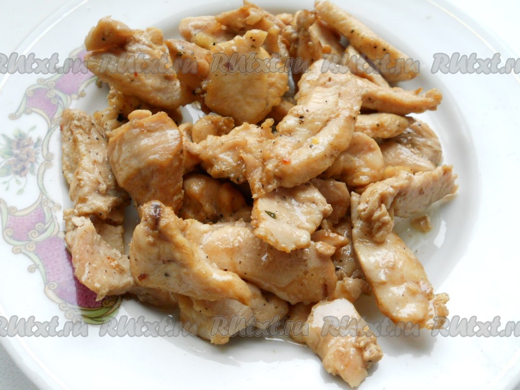 Куриное филе порезать длинными брусочками, посолить, посыпать специями и обжарить на растительном масле в течение 5 минут. Выложить на тарелку.