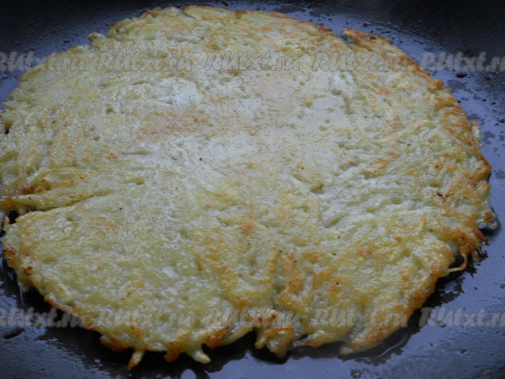 Обжарить на среднем огне до румяности (сильно не зажаривать), затем с помощью лопатки быстро перевернуть картофельную лепешку на другую сторону.