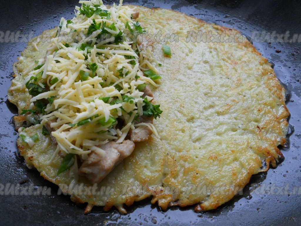 На одну сторону лепешки выложить кусочки подготовленной курицы, сверху щедро посыпать натертым на мелкой терке сыром, смешанным с измельченной зеленью.