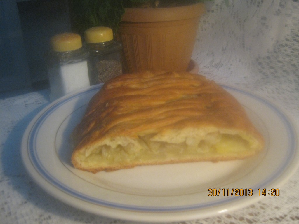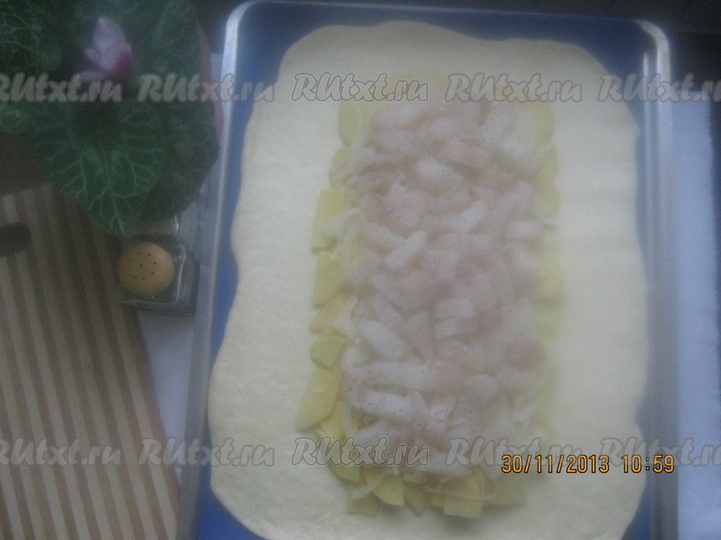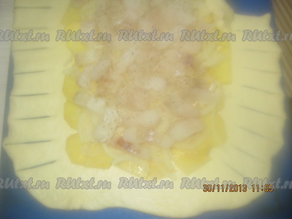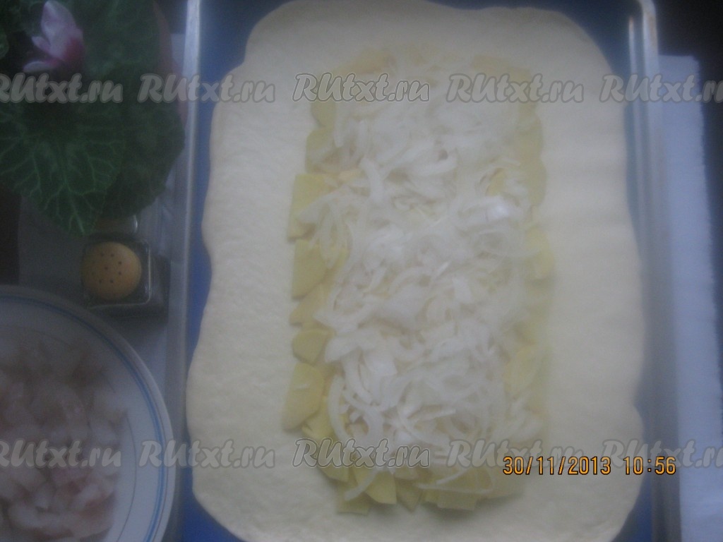 На середину теста, отступив от края 7 сантиметров, выкладываем слой картофеля.