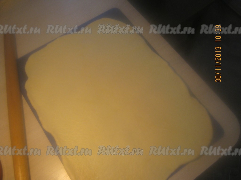 Раскатать тесто. Тесто лучше сразу раскатывать на листе, застеленном пергаментной бумагой, или, как я, на силиконовом листе.