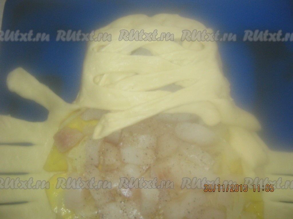 Не доходя до начинки, надрезаем края теста полосками, примерно 2 сантиметра.