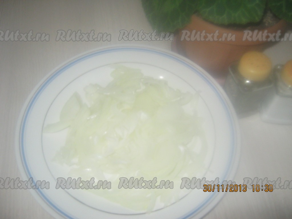 Нарезать лук тонкими полукольцами.