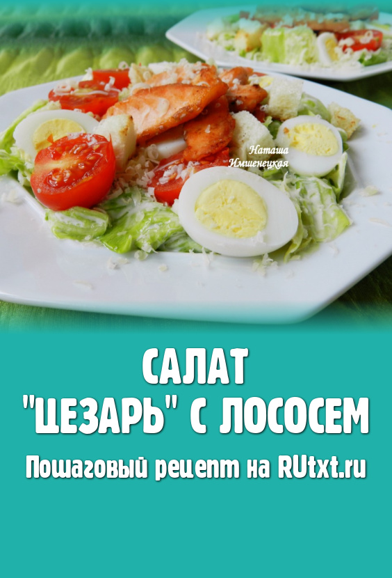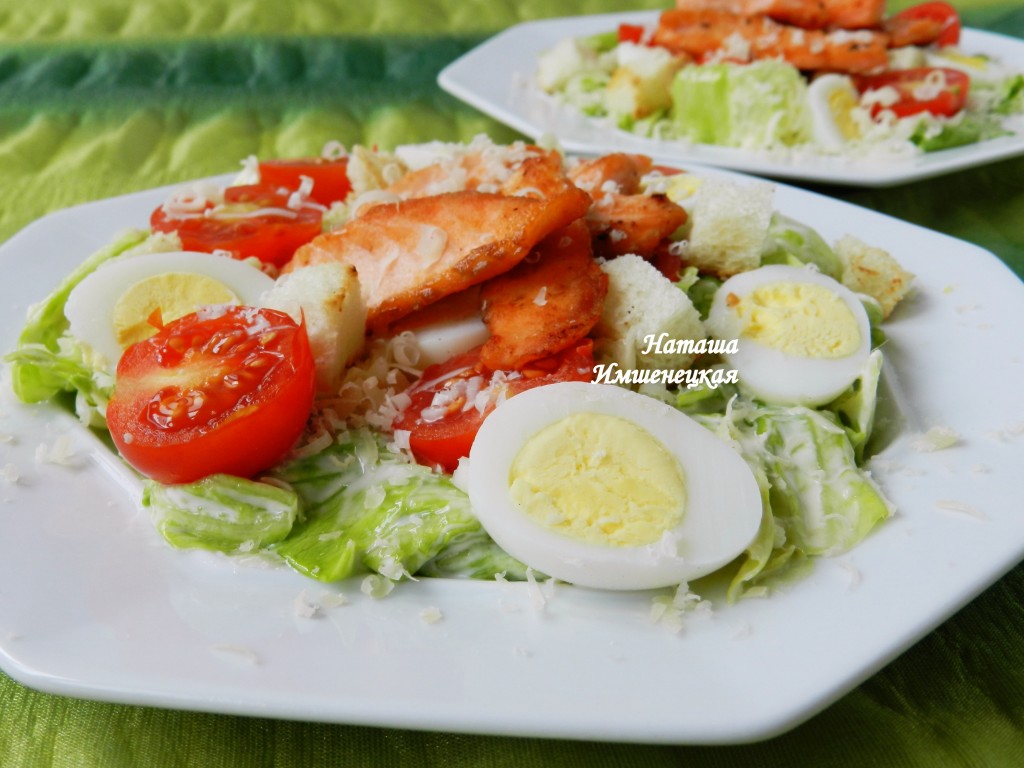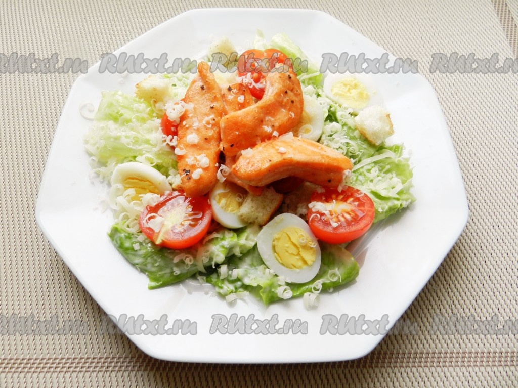 Вкусный и сочный салат "Цезарь" с лососем готов.