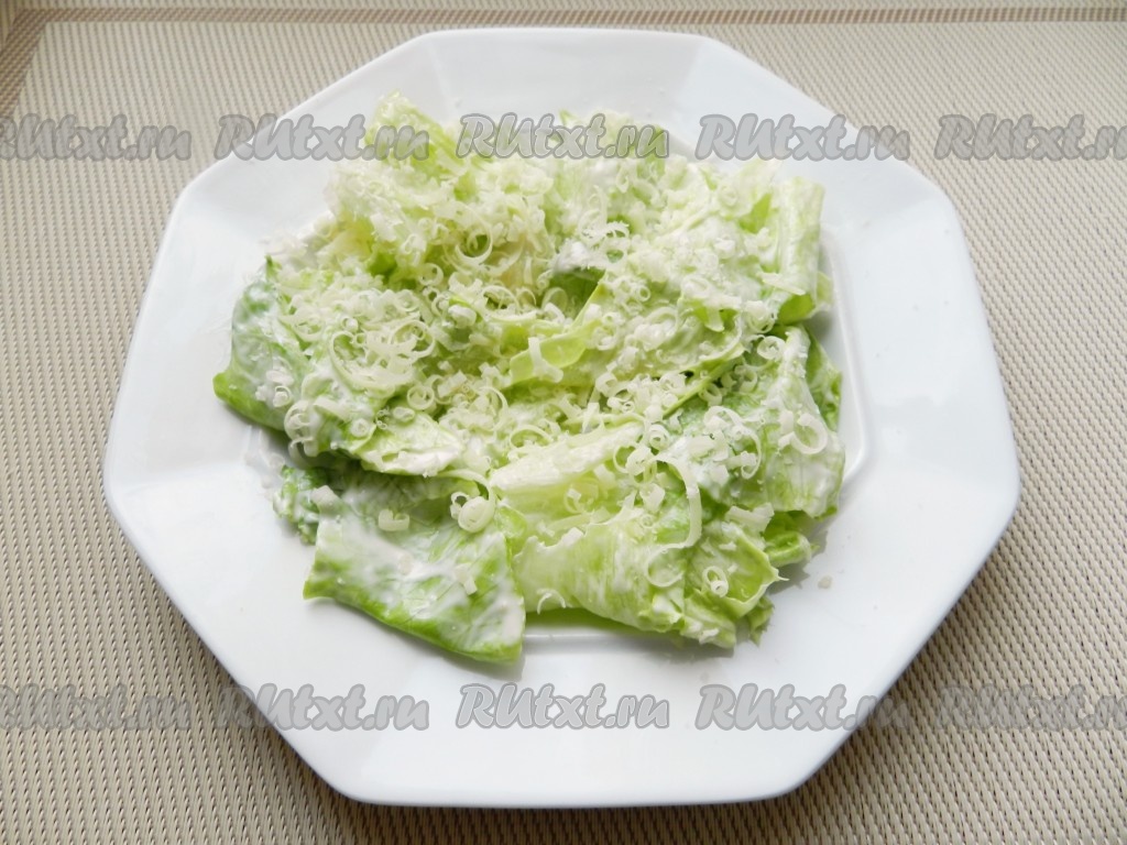 Выложить заправленный салат айсберг на тарелку, присыпать натертым на терке сыром.