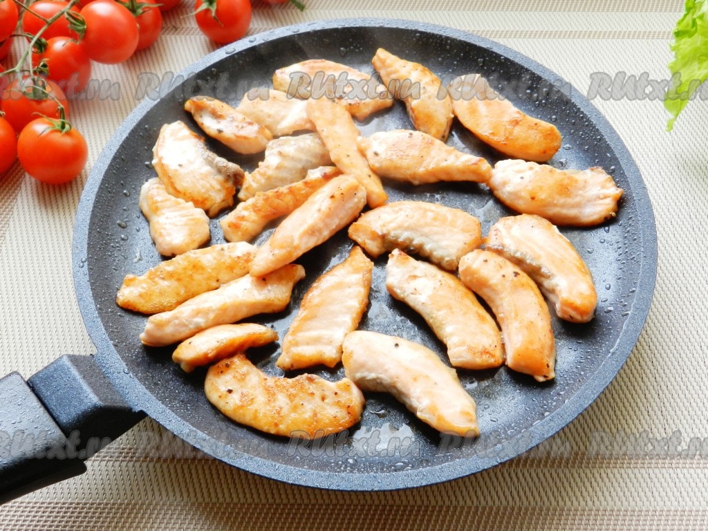Филе лосося нарезать небольшими полосками, приправить солью и перцем, оставить на 15 минут.