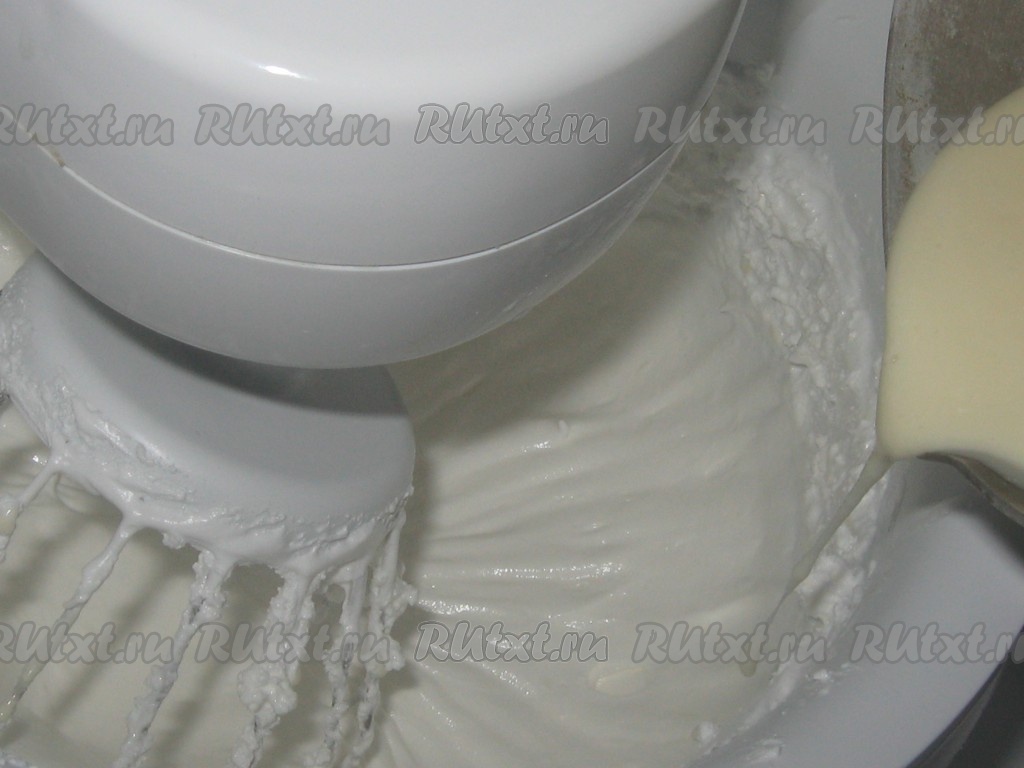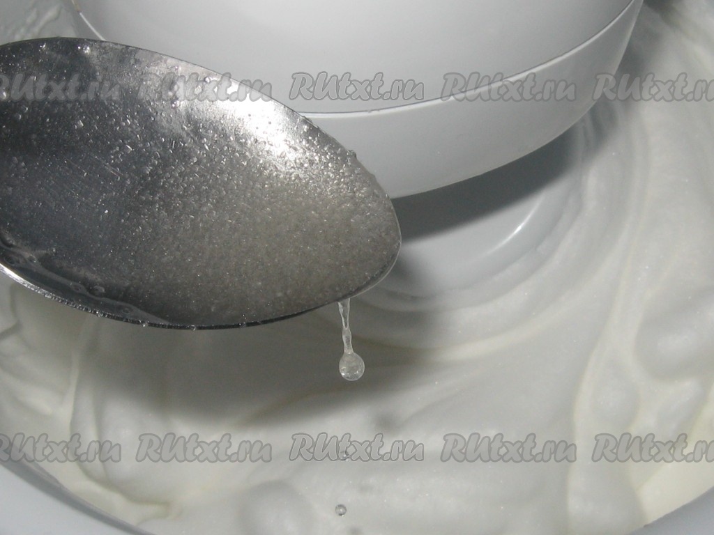 Не переставая взбивать белки, тонкой струйкой (или буквально по каплям) влить в них сироп и продолжать взбивать ещё 15 минут, в конце взбивания добавить 1 чайную ложку лимонного сока, должна получиться блестящая, эластичная масса.