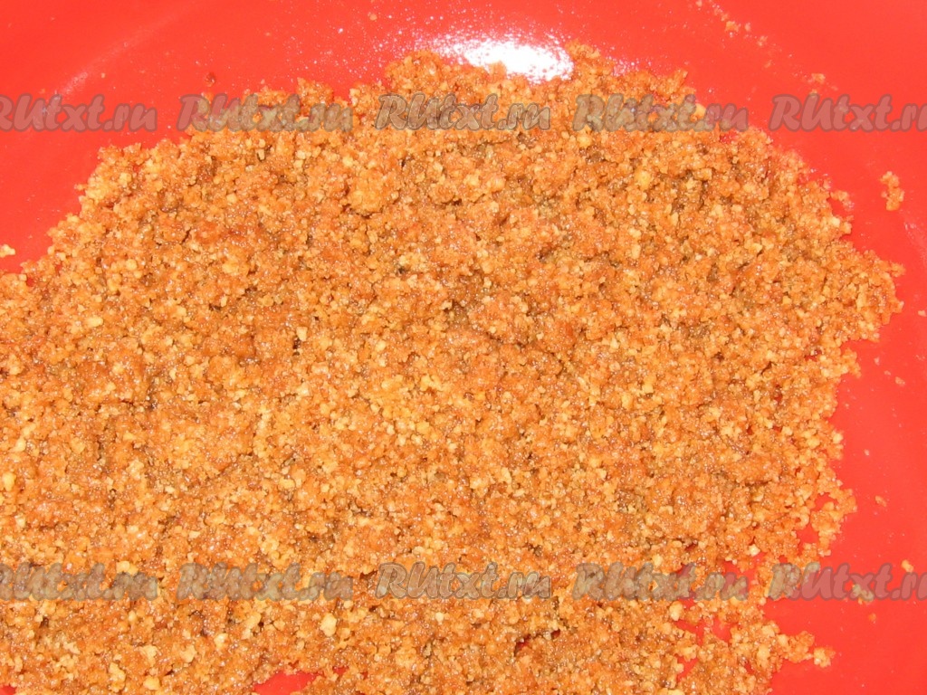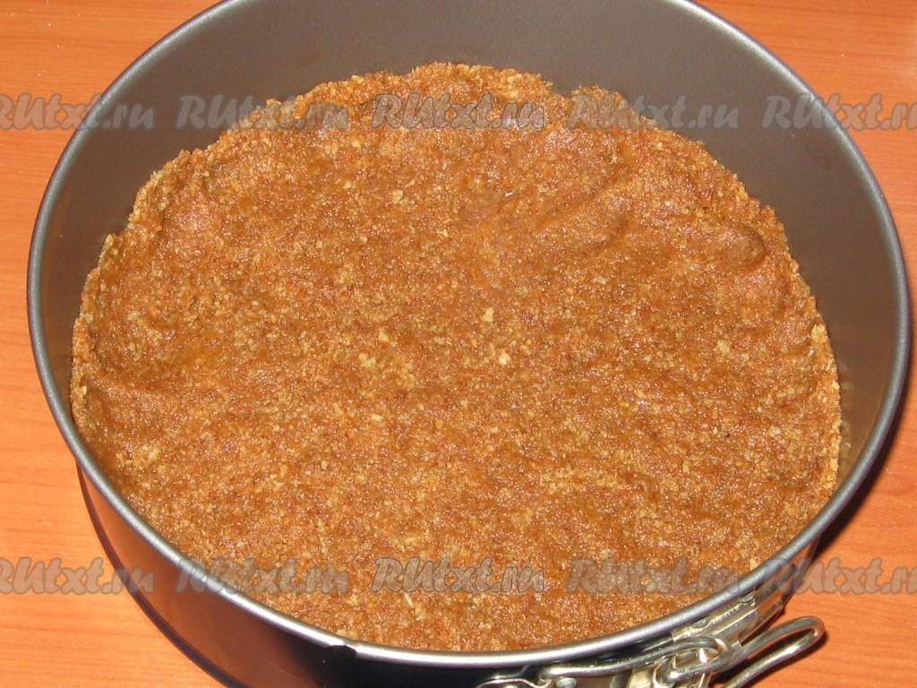 Масляную крошку утрамбовать по дну формы (у меня разъёмная форма диаметром 22 сантиметра), сделать бортики высотой, примерно, 0,5 сантиметра.