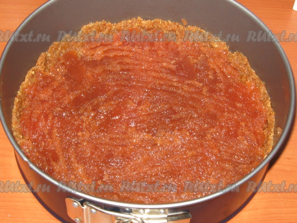 Выложить на основу повидло и равномерно распределить, поставить в разогретую до 200 градусов духовку на 10 минут, достать и охладить.