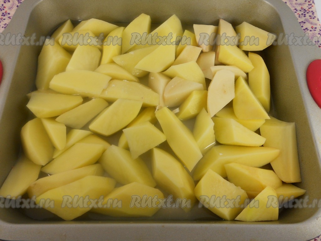 Картофель очистить и нарезать крупными дольками. Выложить в форму для запекания ровным слоем. Залить куриным бульоном.