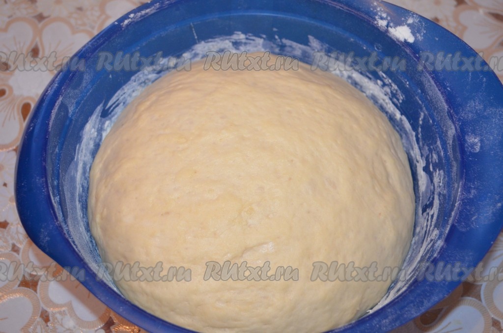 Вот так выглядит подошедшее дрожжевое тесто для наших ватрушек. Выложить его на стол, обмять.