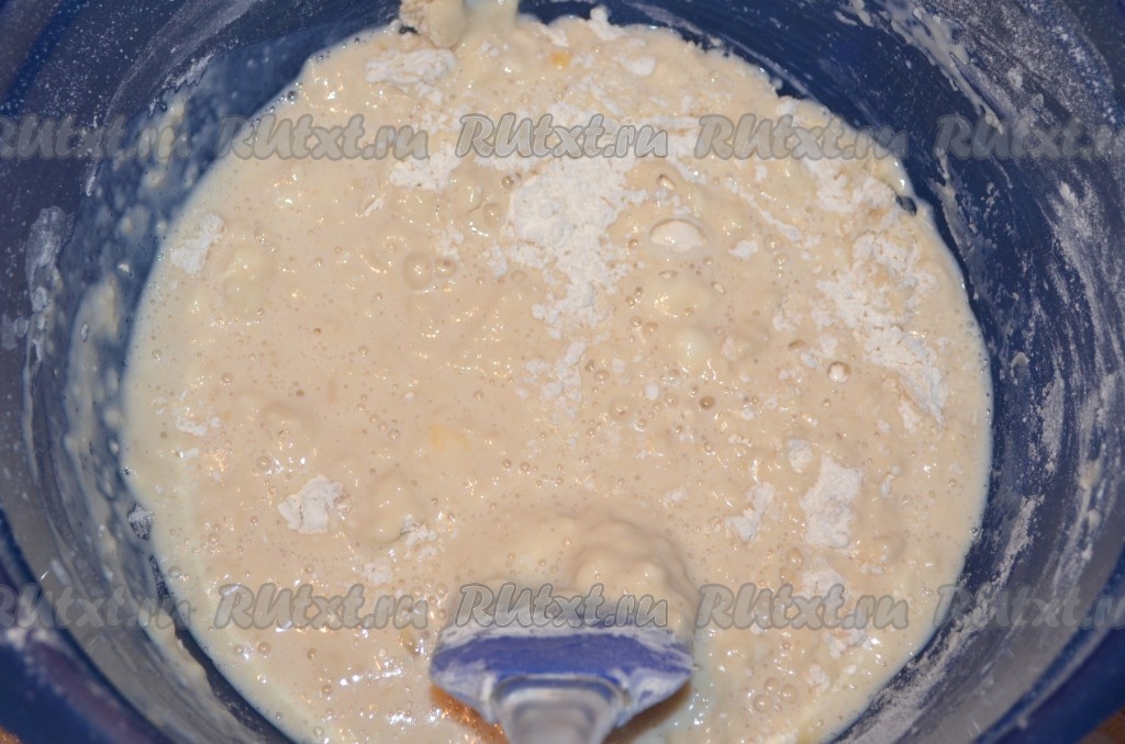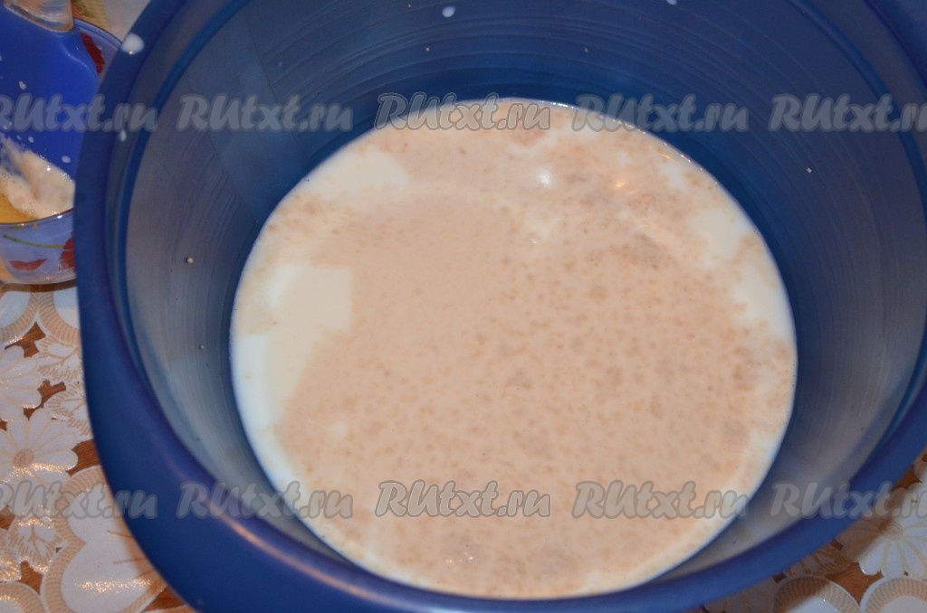 Залить дрожжи с сахаром теплым молоком, перемешать и оставить на 10 минут, чтобы образовалась пенка или шапочка сверху.