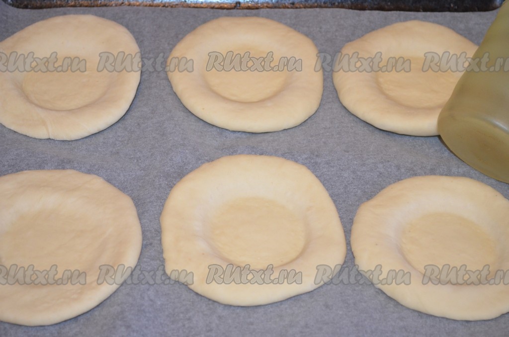 Придать им скалкой круглую форму, в центре сделать углубление. Выложить аккуратно на пергамент на противень. Накрыть полотенцем и оставить на 40 минут.