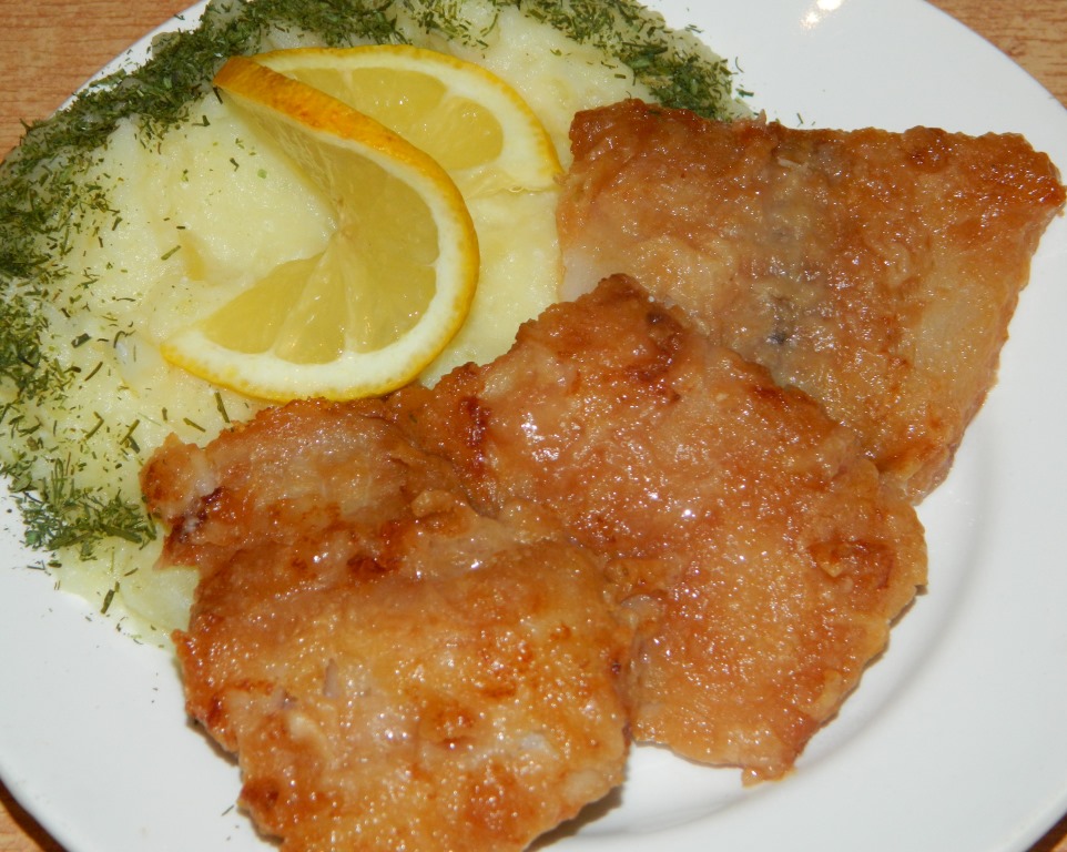 После маринования обваливаем рыбу в муке с двух сторон, выкладываем в сковороду, хорошо разогретую с растительным маслом, и обжариваем с двух сторон до золотистого цвета.