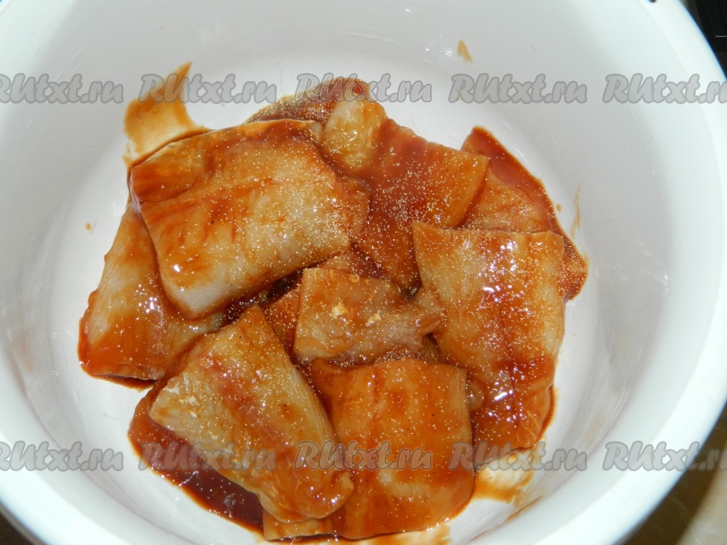 Складываем нарезанную рыбу в миску, добавляем соевый соус, специи по вкусу (я добавила немного чесночного порошка), аккуратно перемешиваем и оставляем промариноваться минут на 30. За это время можно 1-2 раза перемешать, чтобы рыбка равномерно пропиталась соевым соусом. Соль я не добавляла, так как соевый соус у меня был достаточно солёным.