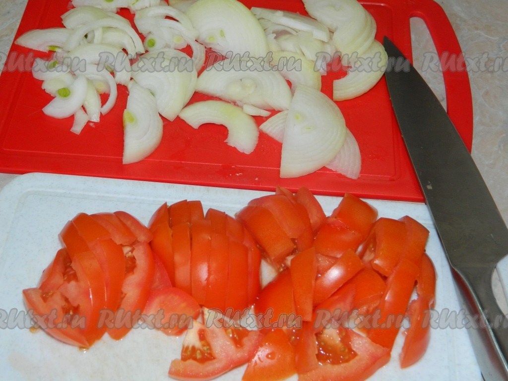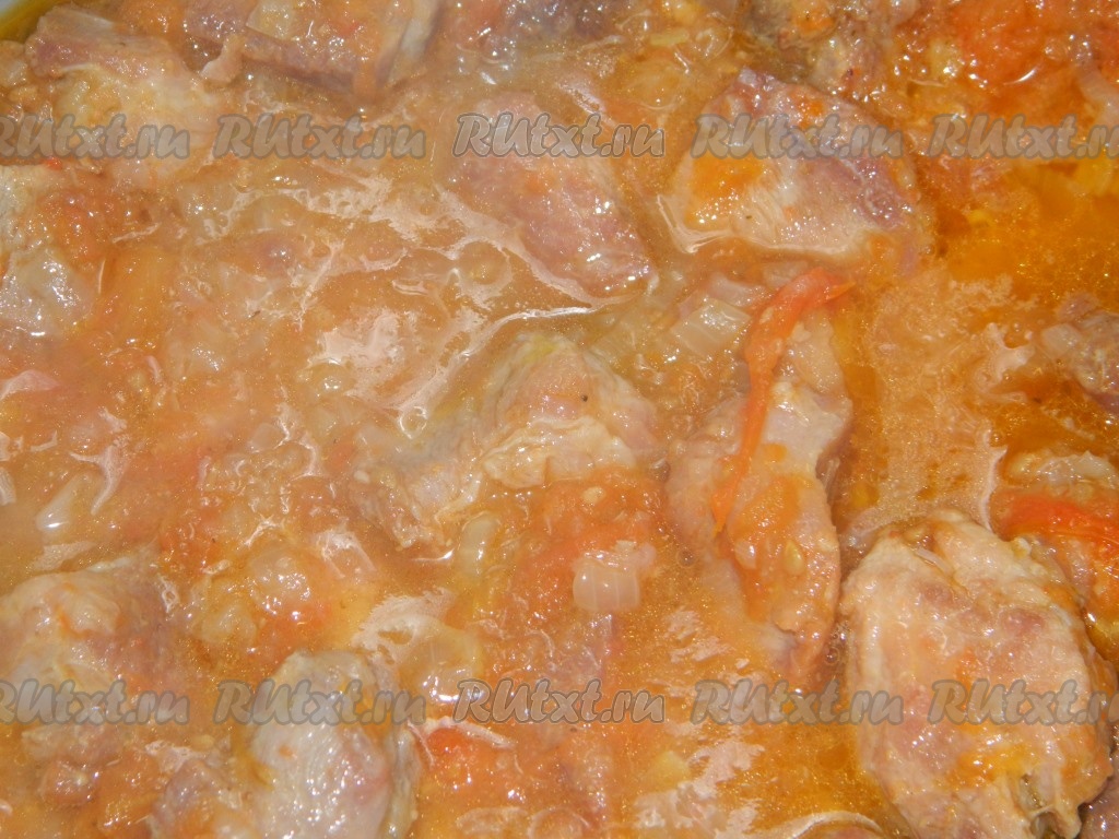 Пока обжаривается мясо, режем лук и помидоры. Затем добавляем овощи к мясу, подливаем немного воды или бульона. Соль и специи по вкусу. Оставляем на маленьком огне тушиться минут 30-40.