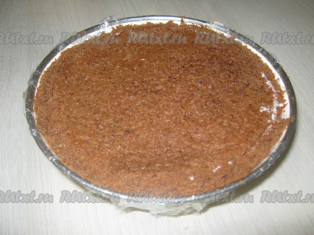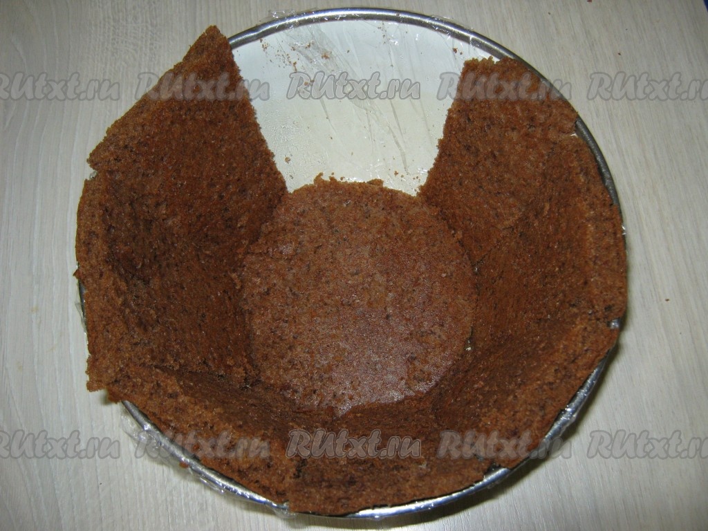 Чашу, с помощью которой мы вырезали круг, застилаем пищевой плёнкой. Оставшийся корж режем на треугольники (если у вас чаша с прямым дном, как у меня, то я сначала вырезала дно, а потом боковинки в виде прямоугольников, зауженных книзу чаши). Вырезанными кусочками выкладываем всю чашу. Если у вас получаются где-то щели, то их можно засыпать крошкой, оставшейся от коржа. Самое главное, чтобы вся чаша была закрыта (у меня на фото я еще не положила один кусочек).