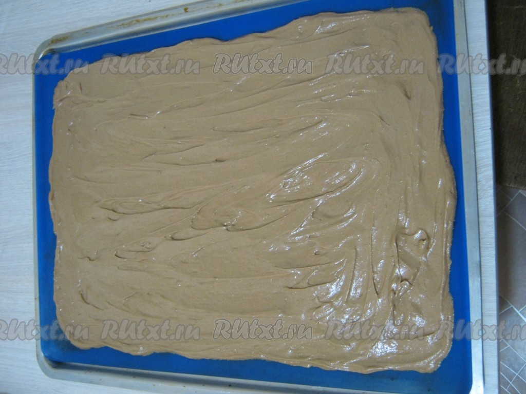 Противень застилаем пекарской бумагой (у меня силиконовый лист и противень размером 30 на 35 см). Тесто ровным слоем выкладываем на лист и ставим в разогретую до 180 градусов духовку на 15-20 минут.