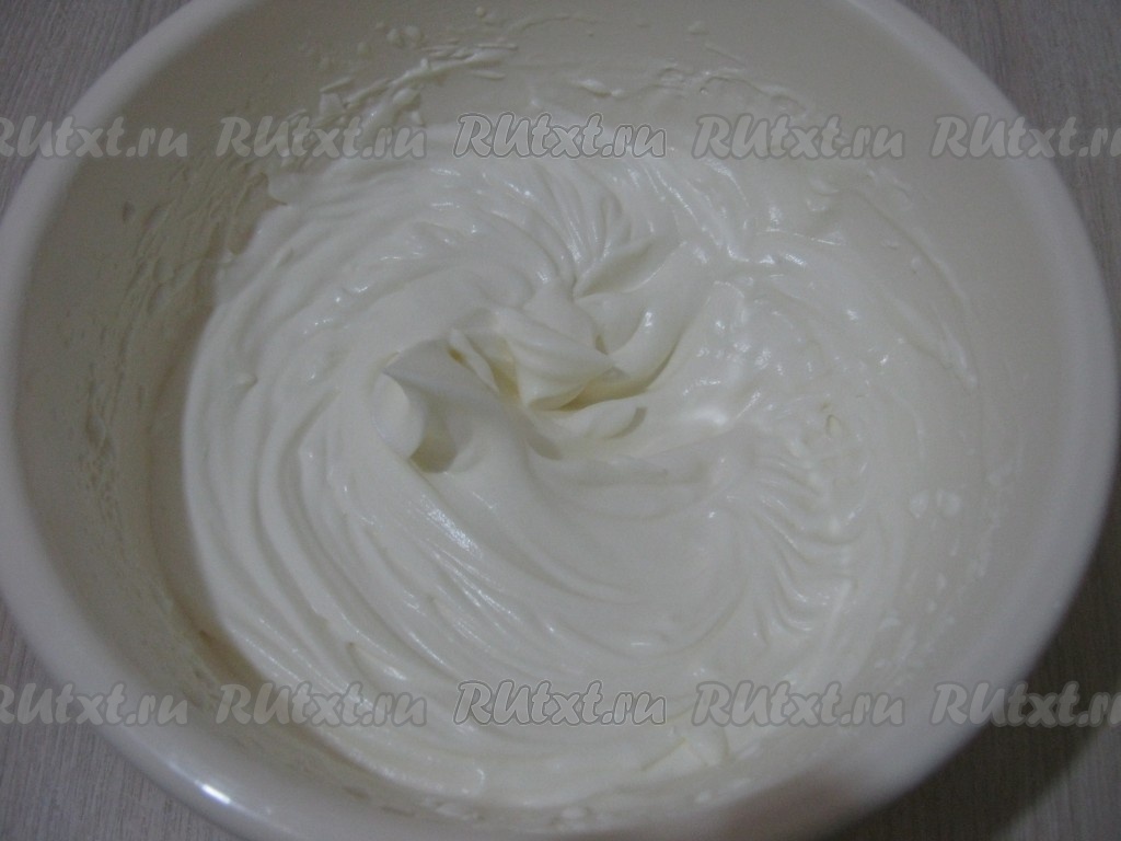 Сливки достать из холодильника и взбить с сахарной пудрой. Взбивать нужно до тех пор, пока на креме Вы не увидите следы от венчика, которые не будут оседать, а поднятая вверх ''пика'' из крема не опадёт (если Вы первый раз взбиваете сливки, то я Вам советую перед взбиванием венчики от миксера и чашку, в которой Вы будете взбивать, положить в морозилку. Так крем лучше получится).