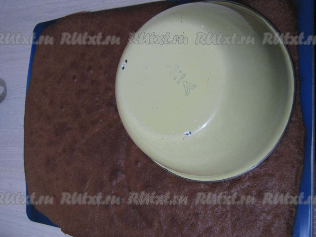 После того как корж готов, мы аккуратно его выкладываем на стол вместе с бумагой. Берём чашку объемом 1,5 литра и с краю коржа вырезаем круг.