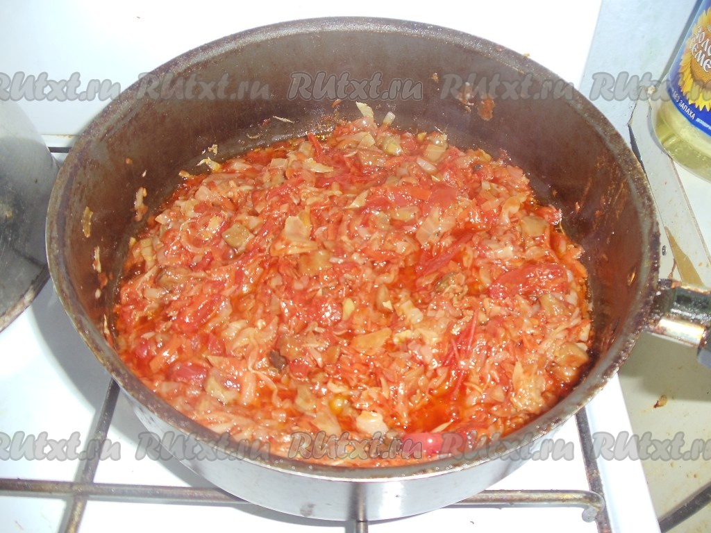 Открыть баночку с солянкой и половину выложить на чистую сковороду, не добавляя масла (оно есть в составе солянки), немного разогреть и добавить томатную пасту, все хорошо перемешать, жарить минуты 2 и выключить.