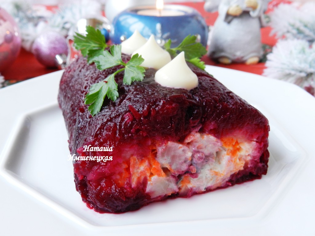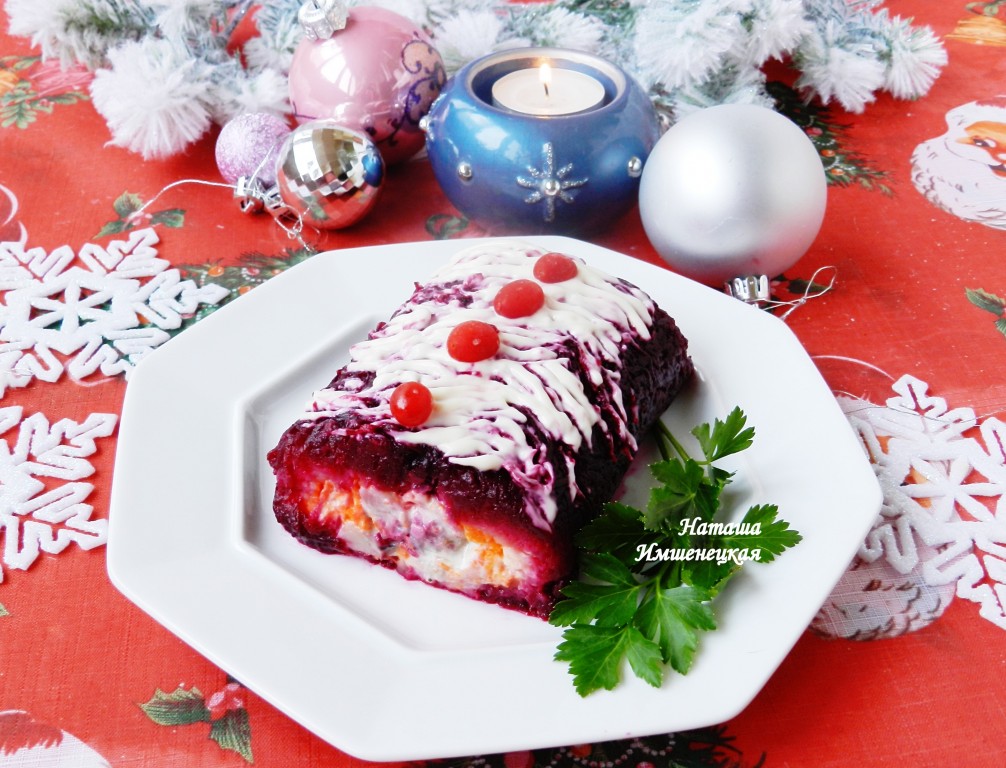 Предлагаю традиционный салат "Сельдь под шубой" приготовить в виде рулета. Такая закуска будет очень эффектно смотреться на вашем праздничном столе. Количество майонеза при смазывания слоёв я стараюсь свести к минимуму. Приготовьте яркий салат-рулет "Селёдка под шубой" и насладитесь его приятным вкусом!