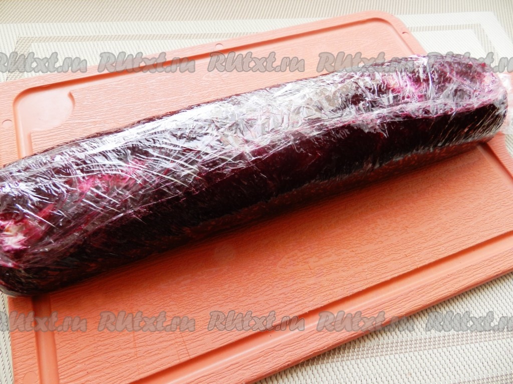 Прежде всего нужно отварить в кожуре до готовности свеклу (на варку с момента закипания воды потребуется минут 50-70). В отдельной кастрюле сварить в кожуре морковку и картошку (на отваривание картофеля после начала кипения воды потребуется минут 20-25, моркови - минут 30-35). Варёные овощи полностью остудить. На разделочной доске расстелить пищевую плёнку. Свеклу очистить, натереть на мелкой тёрке, отжать лишний сок и разложить на поверхности плёнки, немного посолить и поперчить. Со всех сторон должны оставаться свободные края плёнки примерно по 3 сантиметра или больше.