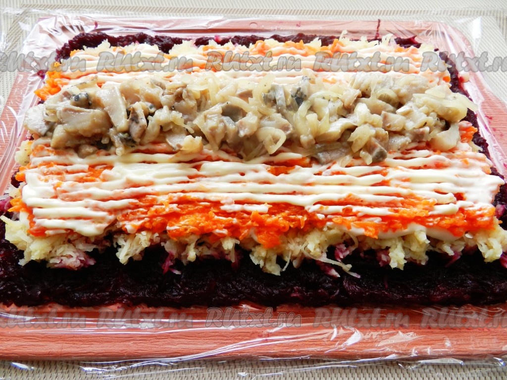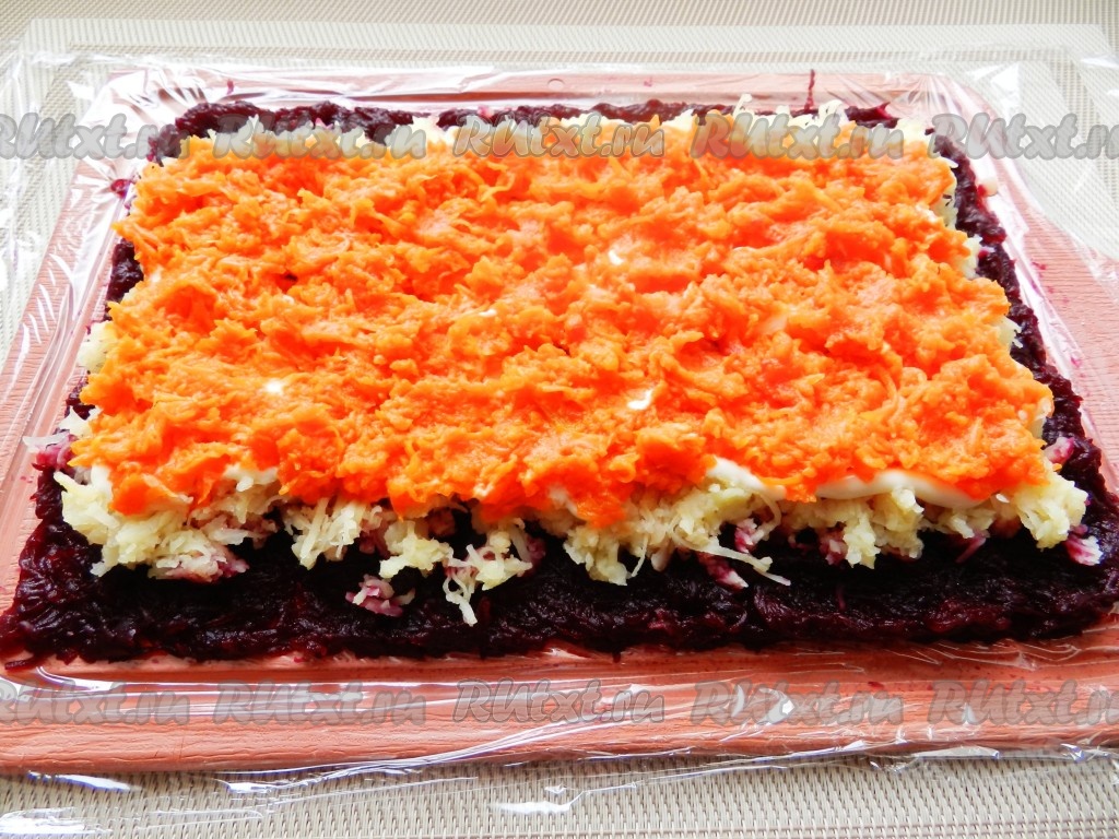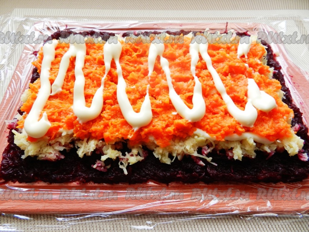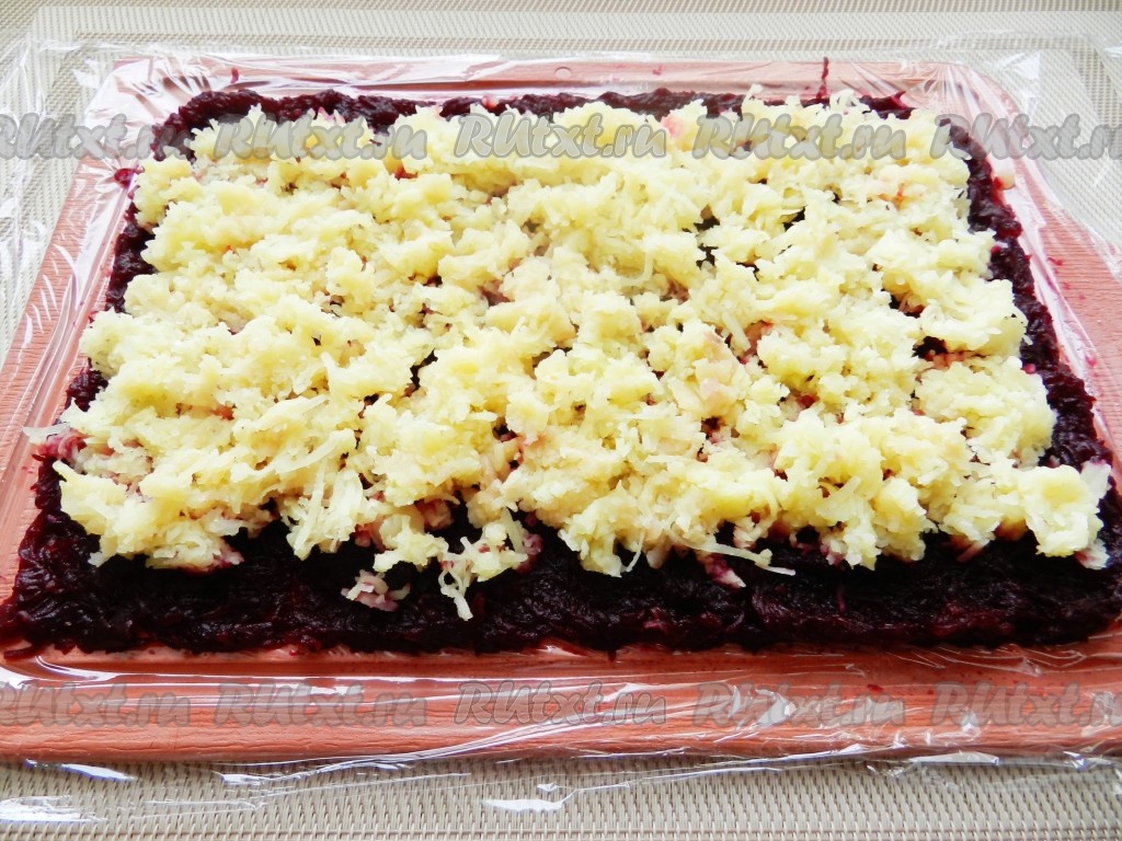 На слой свеклы равномерно разложить слой очищенного и натёртого на мелкой тёрке картофеля, подсолить немного. Слой картофеля должен быть меньше свекольного примерно на 1 сантиметр с двух длинных сторон. На картофель нанести сетку из майонеза.