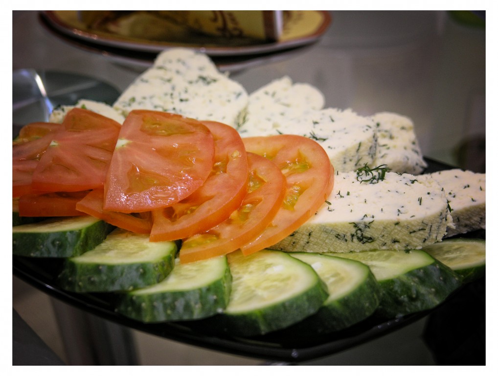 Подавать домашний сыр можно с овощами. Приятного аппетита!