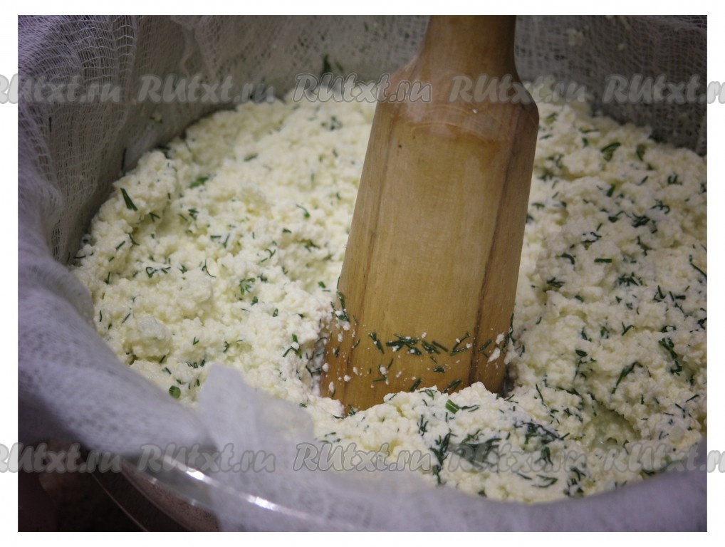 Завязываем марлю. Ставим домашний сыр под гнет на 6-8 часов на холод.