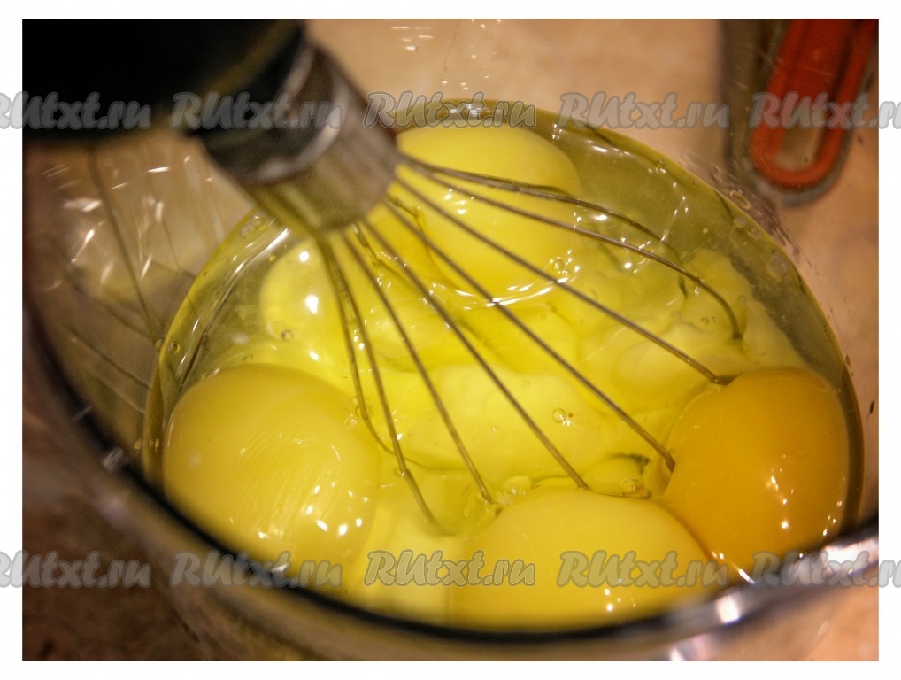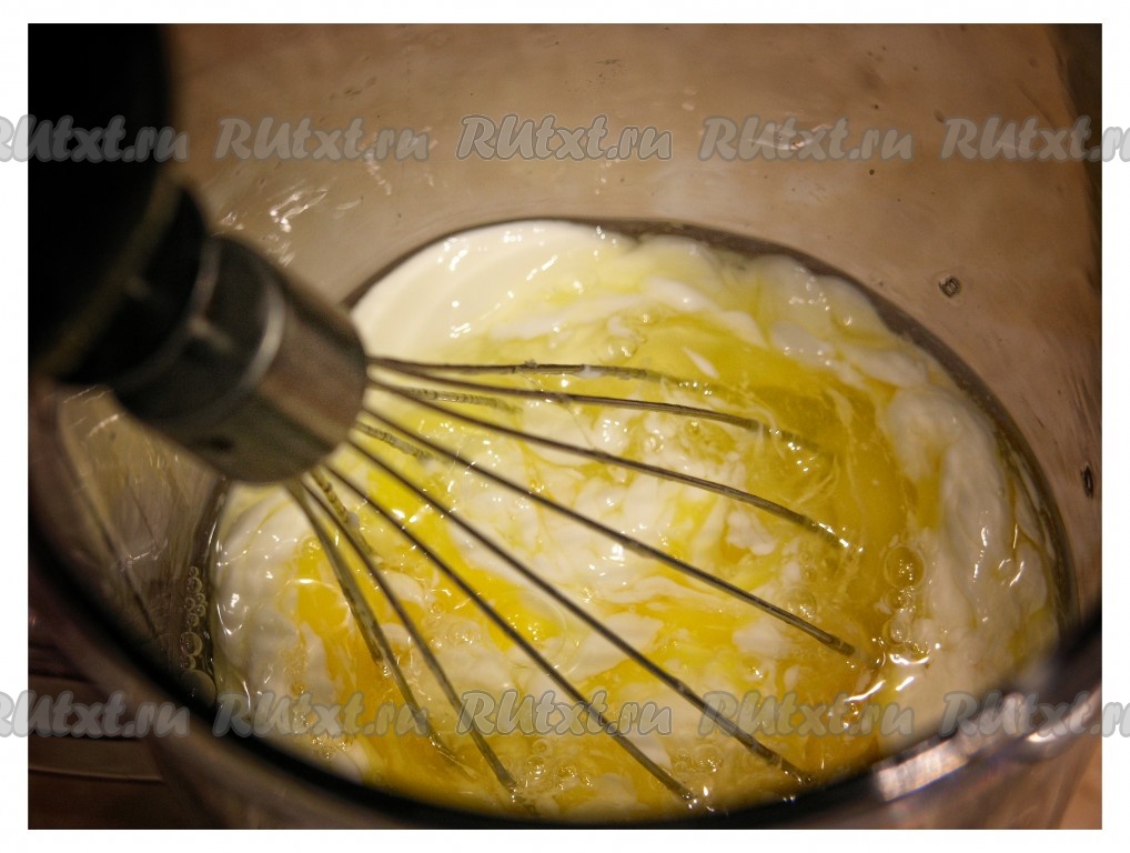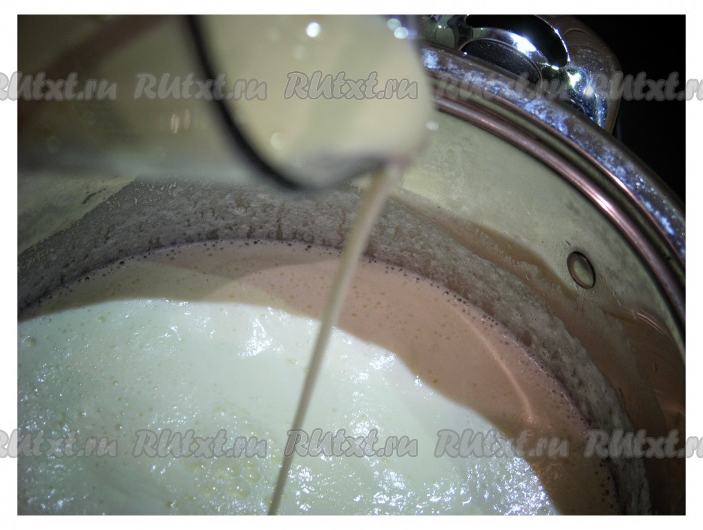 Тонкой струей вливаем сметанно-яичную массу в молоко.