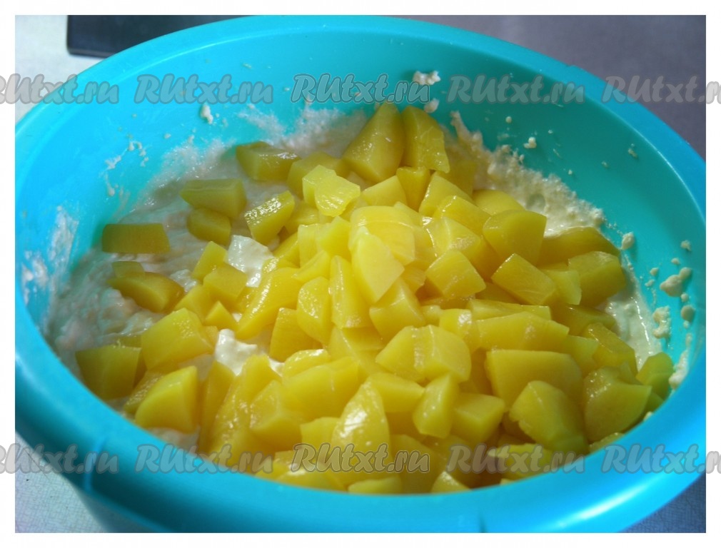 Персики нарезать (не очень мелко) и перемешать с творожной массой.