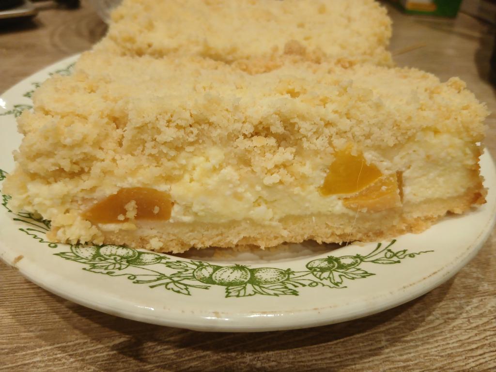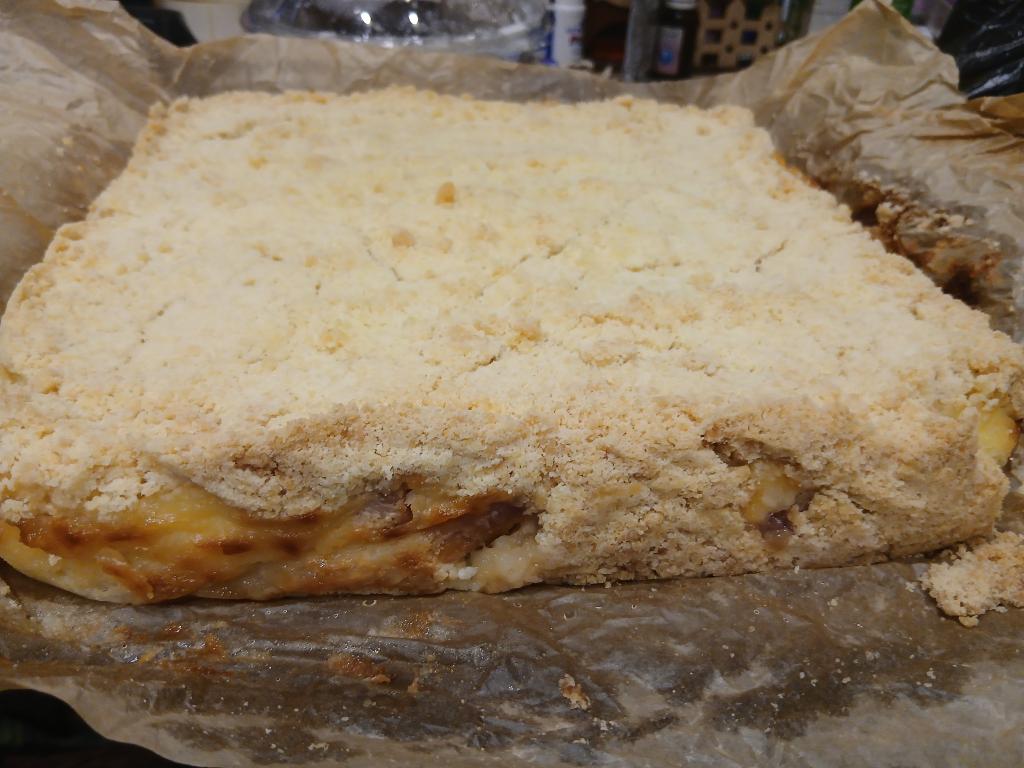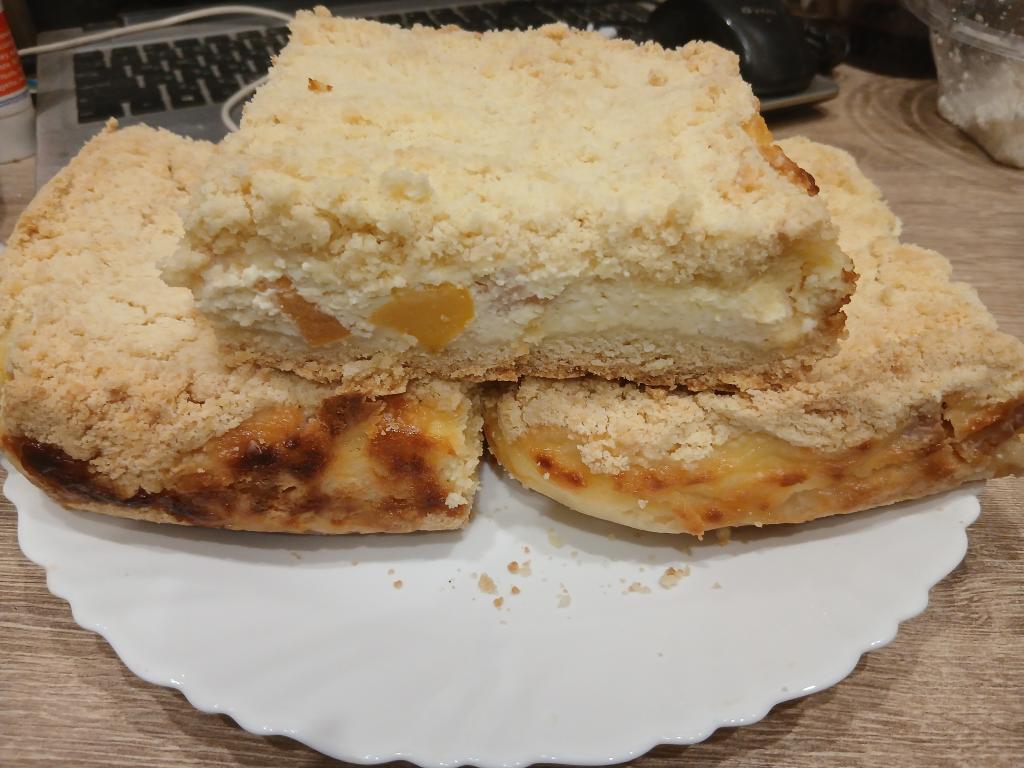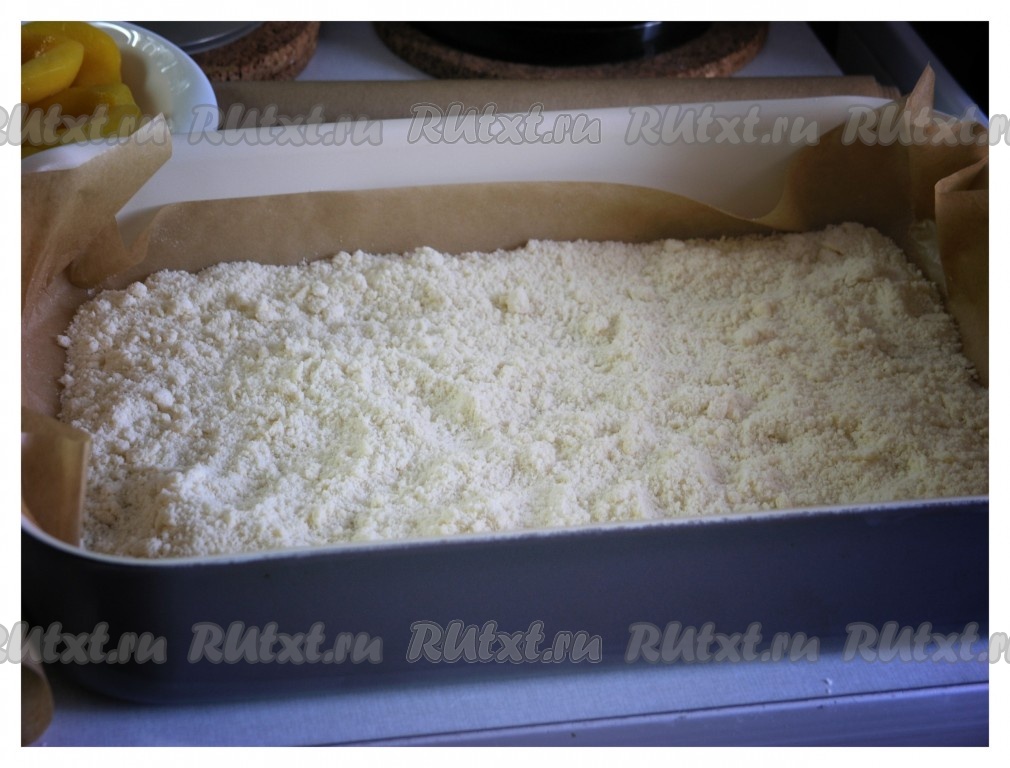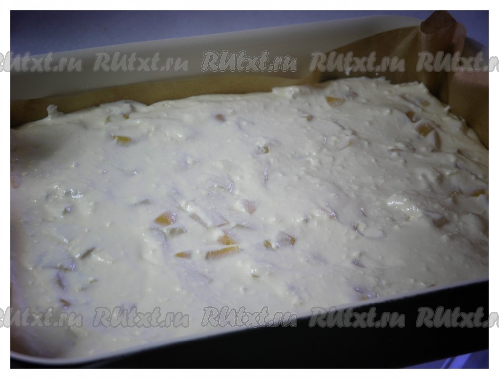 Равномерно выложить всю творожную массу, смешанную с персиками, на противень (или в форму) поверх крошки.