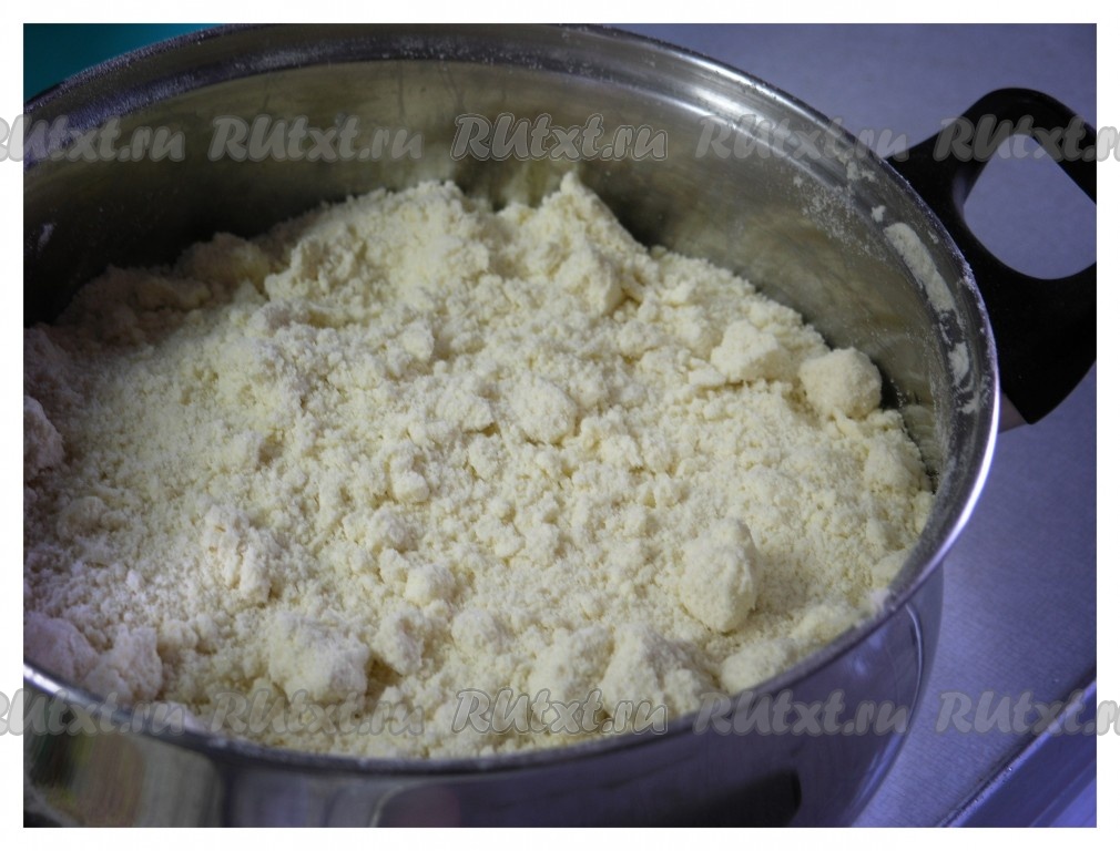 В другой глубокой миске (или объёмной кастрюле) смешать просеянную муку, разрыхлитель и сахар, добавить натёртое на тёрке сливочное масло (или маргарин), перетереть руками до получения сыпучей крошки.