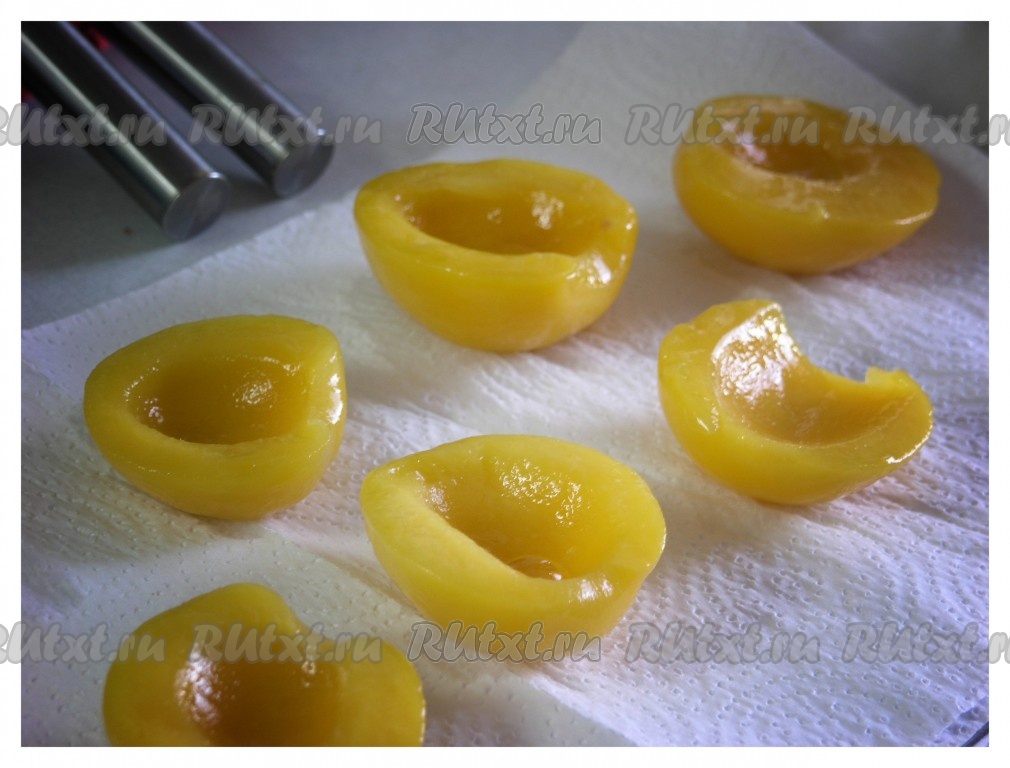 Половинки персиков выложить на салфетки (или на бумажные полотенца), чтобы фрукты немного обсохли.
