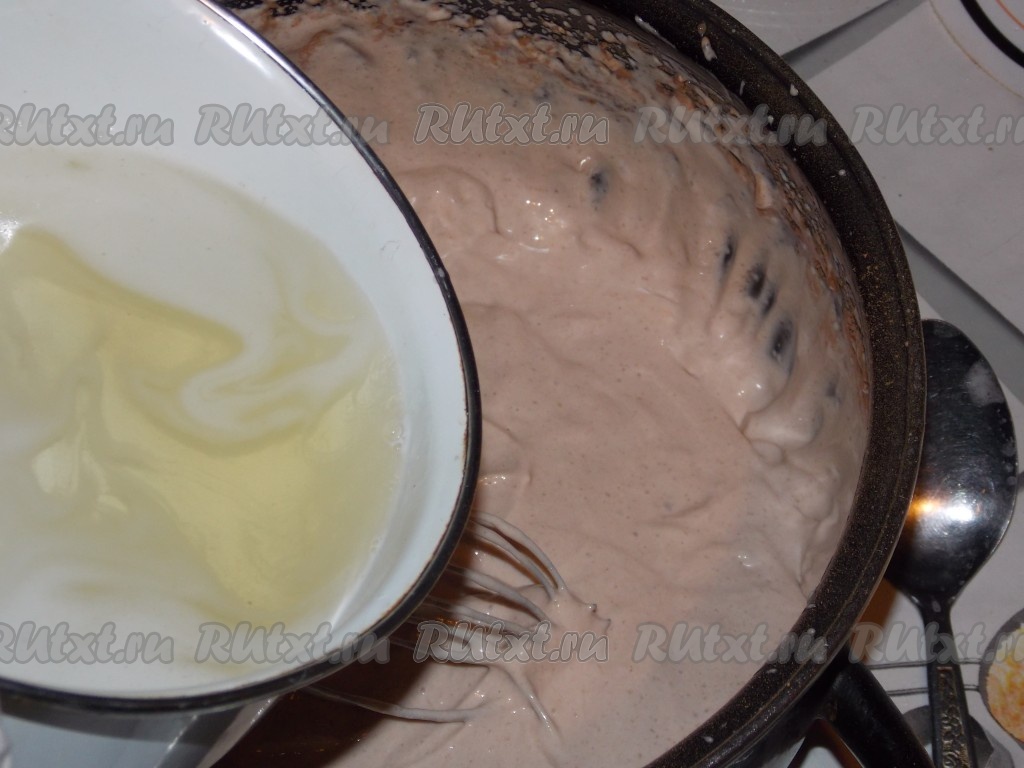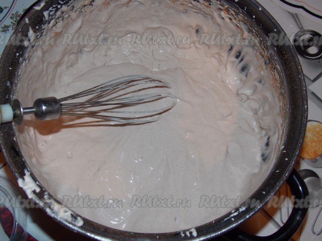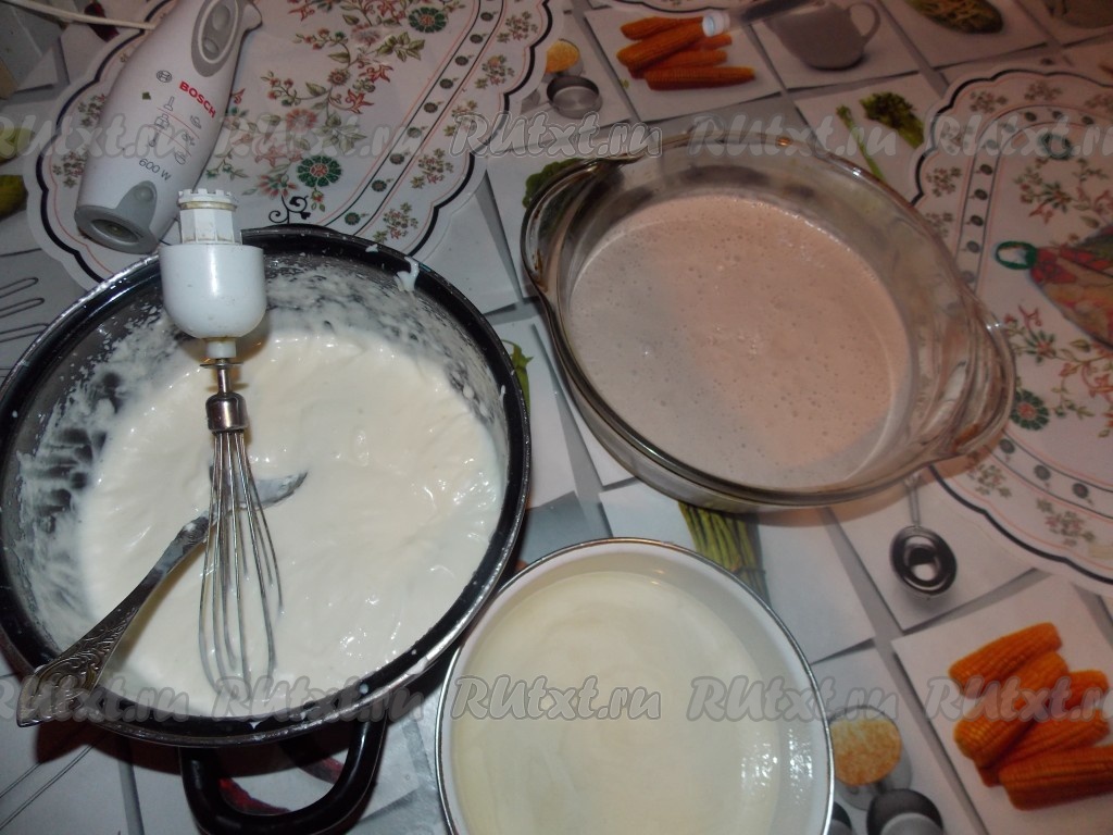 Когда первый слой сметанного десерта застынет, начинаем делать второй слой. Как и в первом слое, половину литра сметаны взбиваем с сахаром, и на этот раз, вместо какао, добавляем ванилин.