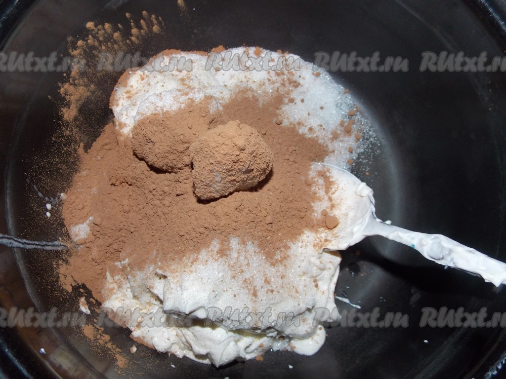 Начнем с приготовления первого слоя десерта. Для этого берем 0,5 литра сметаны, добавляем к ней 200 грамм сахара и 3 чайные ложки какао.