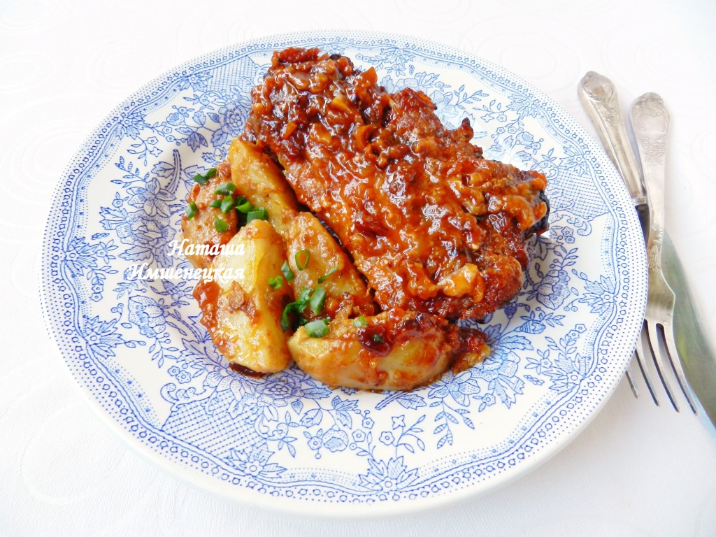 Вкусные, ароматные и сочные свиные рёбрышки достать из духовки и подать к столу вместе с медово-горчичным соусом.