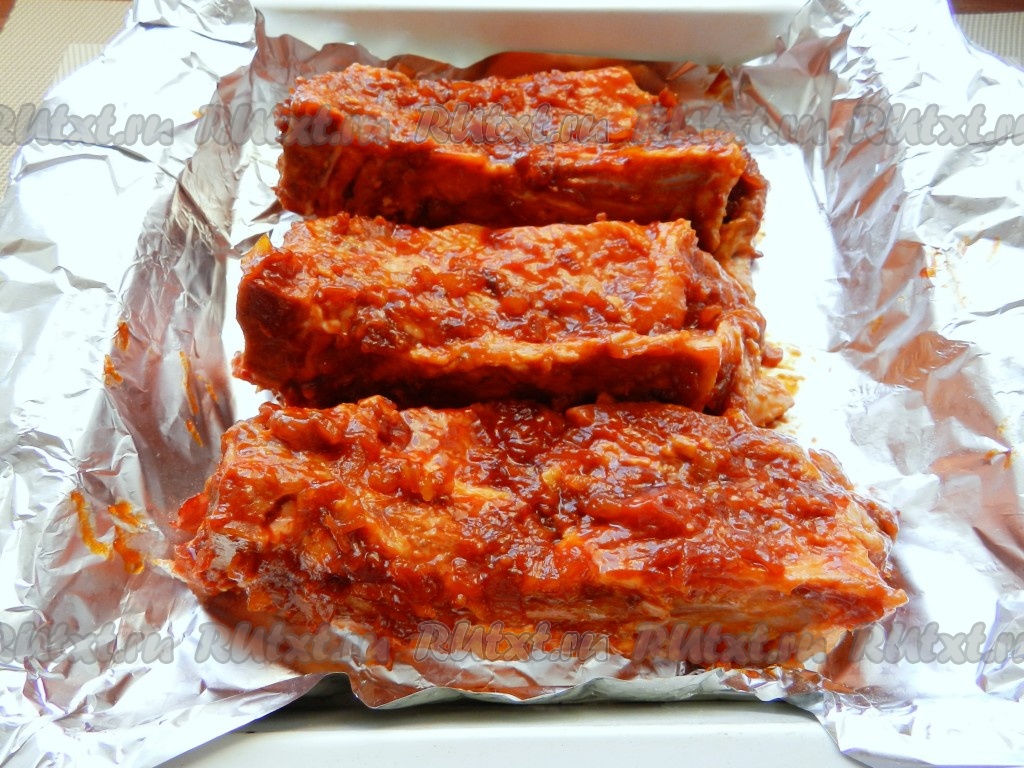 Смазать свиные рёбрышки соусом из мёда, горчицы и кетчупа со всех сторон. Выложить в форму для запекания, застеленную фольгой. Запечь рёбрышки в разогретой духовке при температуре 200 градусов в течение 50 минут.