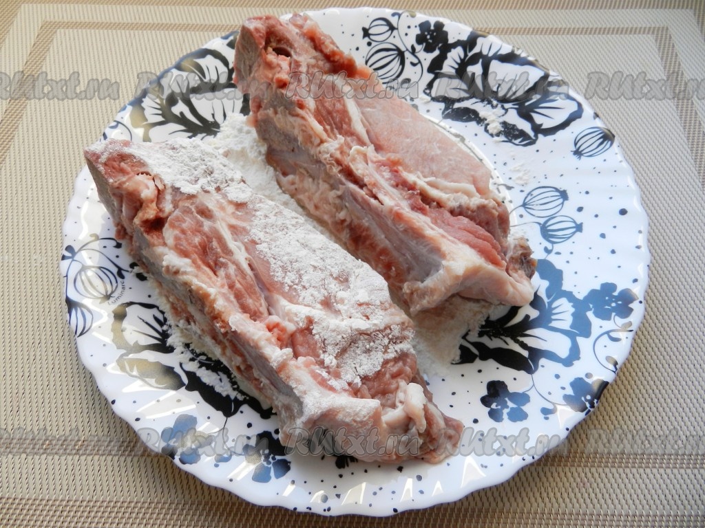 Свиные рёбра разрезать по кости и присолить. Затем каждое рёбрышко обвалять в муке со всех сторон.