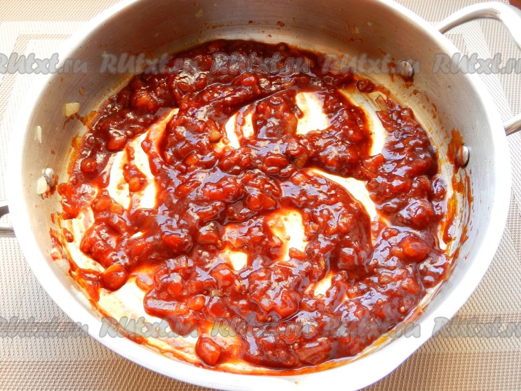Добавить в сковороду к луку кетчуп (вместо кетчупа можно взять томатный соус), мёд и горчицу. Перемешать и готовить на медленном огне 1-2 минуты, постоянно помешивая, чтобы соус не пригорел. Посолить соус по вкусу. Снять соус с огня и дать немного остыть.