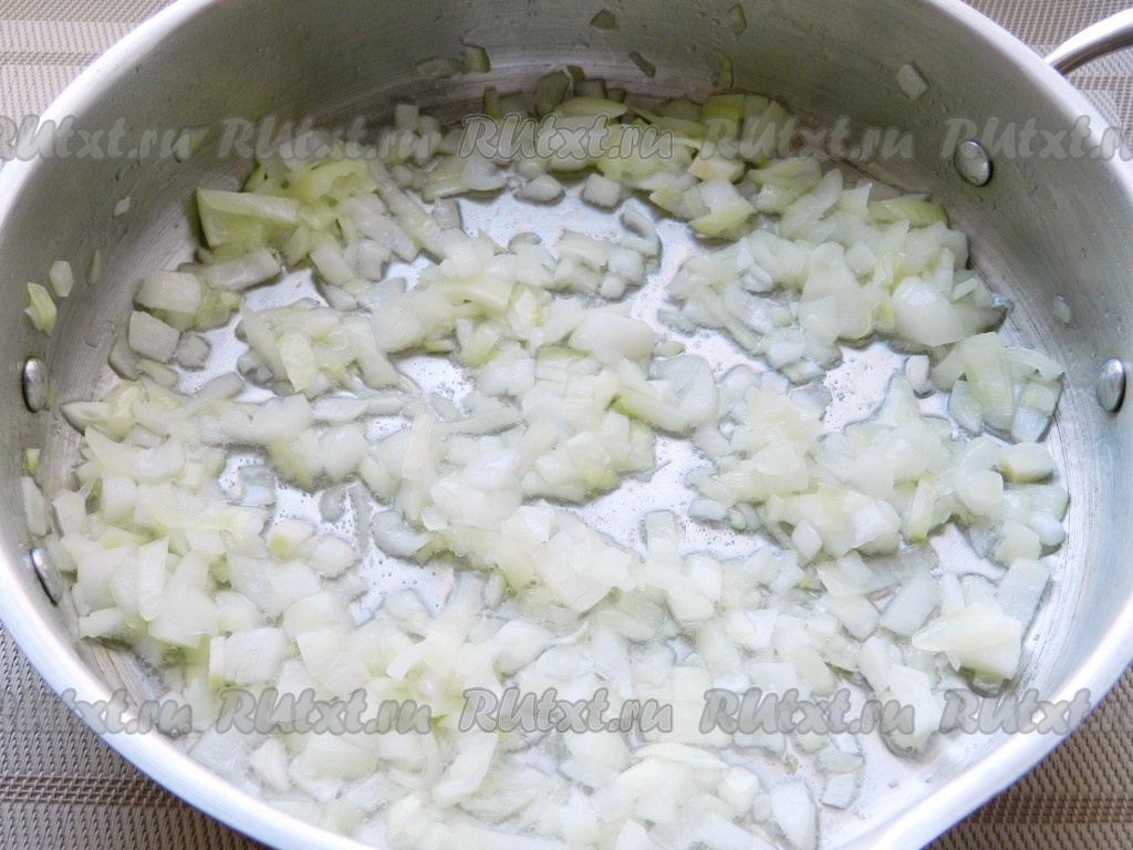 Лук и чеснок очистить. Лук мелко нарезать, чеснок пропустить через пресс. Добавить лук с чесноком в сковороду с растительным маслом и обжарить на среднем огне до мягкости (в течение 4-5 минут), иногда помешивая.