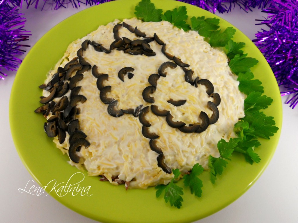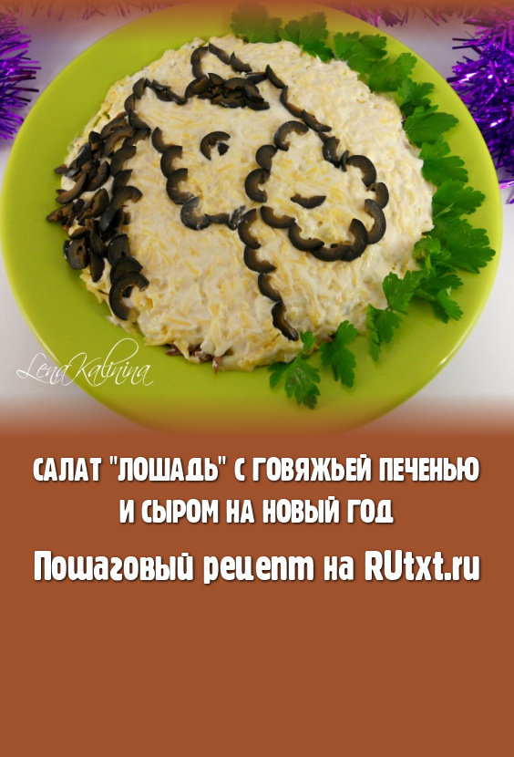 Предлагаю вам рецепт простого, но в тоже время очень вкусного, сытного салата с говяжьей печенью и сыром. Этот салат можно подать и к семейному обеду или ужину, и к праздничному столу. Я решила подать его к новогоднему столу. А поскольку хозяйка наступающего нового года - лошадь, поэтому я и украсила этот салат с помощью оливок в виде головы лошади. Сделать такое оформление совсем несложно, а смотрится блюдо отлично! Салат получается очень вкусным, поэтому, при желании, можете удвоить количество ингредиентов и повторить слои.