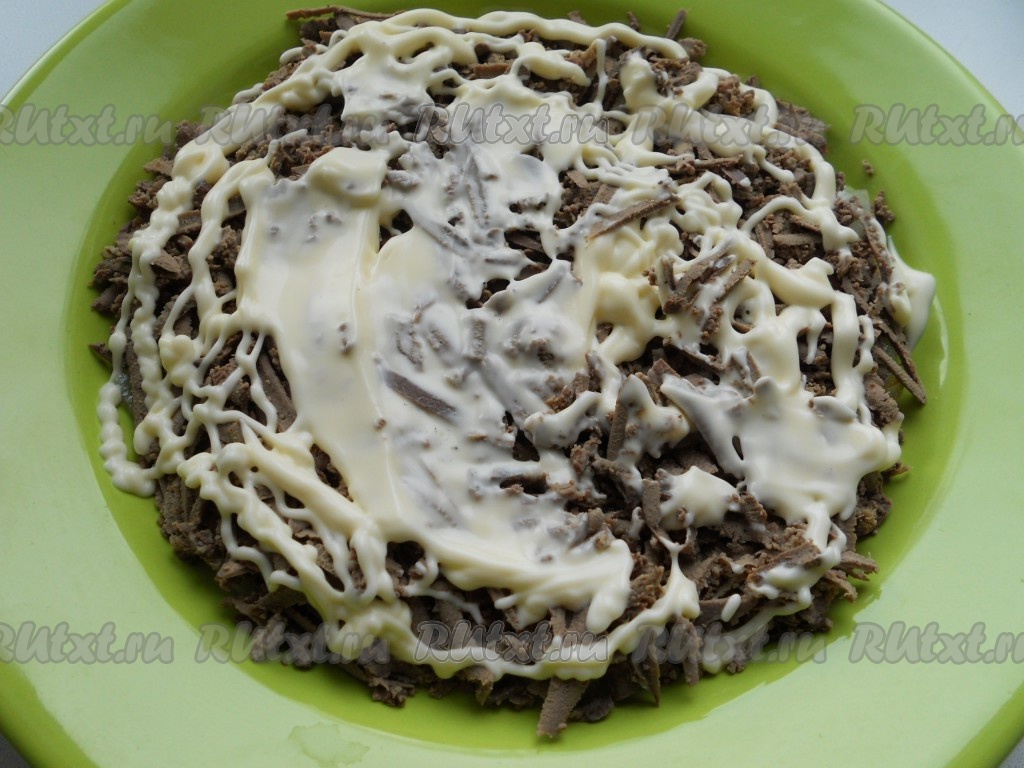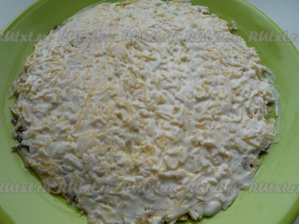 Верхний слой - натёртый на крупной тёрке сыр. Хорошо смазать майонезом.
