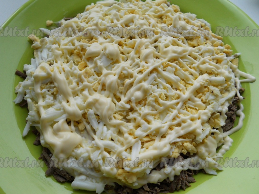 Яйца натереть на крупной тёрке, выложить следующим слоем, нанести сеточку из майонеза.
